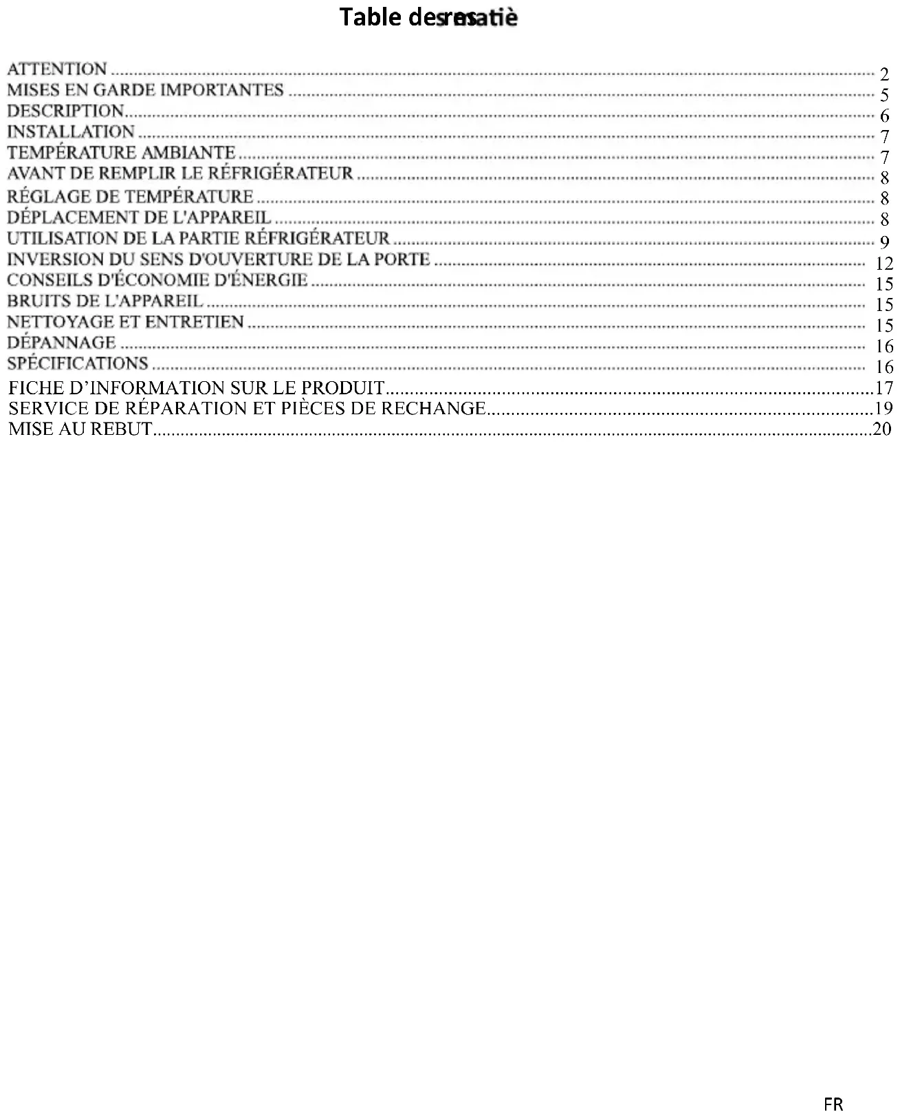 FICHE D’INFORMATION SUR LE PRODUIT.....................................................................................................17 SERVICE DE RÉPARATION ET PIÈCES DE RECHANGE................................................................................19 0,6($85(%8720DZ//EsKh>K/Z>/Z>^KE^/'E^ ^hZ/dddEd/sDEdsEd>Ζhd/>/^d/KE >ΖWWZ/>d>^KE^ZsZWKhZ KE^h>dd/KEh>dZ/hZ ATTENTION ĞƚĂƉƉĂƌĞŝůĞƐƚĚĞƐƚŝŶĠăġƚƌĞƵƚŝůŝƐĠĚĂŶƐĚĞƐĂƉƉůŝĐĂƚŝŽŶƐ ĚŽŵĞƐƚŝƋƵĞƐĞƚĂŶĂůŽŐƵĞƐƚĞůůĞƐƋƵĞʹůĞƐĐŽŝŶƐĐƵŝƐŝŶĞƐ ƌĠƐĞƌǀĠƐĂƵƉĞƌƐŽŶŶĞůĚĞƐŵĂŐĂƐŝŶƐďƵƌĞĂƵdžĞƚĂƵƚƌĞƐ ĞŶǀŝƌŽŶŶĞŵĞŶƚƐƉƌŽĨĞƐƐŝŽŶŶĞůƐʹůĞƐĨĞƌŵĞƐĞƚůƵƚŝůŝƐĂƚŝŽŶƉĂƌ ůĞƐĐůŝĞŶƚƐĚĞƐŚƀƚĞůƐŵŽƚĞůƐĞƚĂƵƚƌĞƐĞŶǀŝƌŽŶŶĞŵĞŶƚƐă ĐĂƌĂĐƚğƌĞƌĠƐŝĚĞŶƚŝĞůʹůĞƐĞŶǀŝƌŽŶŶĞŵĞŶƚƐĚĞƚLJƉĞĐŚĂŵďƌĞƐ ĚŚƀƚĞƐʹůĂƌĞƐƚĂƵƌĂƚŝŽŶĞƚĂƵƚƌĞƐĂƉƉůŝĐĂƚŝŽŶƐƐŝŵŝůĂŝƌĞƐ ŚŽƌŵŝƐůĂǀĞŶƚĞĂƵĚĠƚĂŝů Si le câble d'alimentation est endommagé, il doit être remplacé par le fabricant, son service après vente ou des personnes de qualification similaire afin d'éviter un danger. Cet appareil peut être utilisé par des enfants âgés d'au moins 8 ans et par des personnes ayant des capacités physiques, sensorielles ou mentales réduites ou dénuées d’expérience ou de connaissance, s'ils (si elles) sont correctement surveillé(e)s ou si des instructions relatives à l'utilisation de l'appareil en toute sécurité leur ont été données et si les risques encourus ont été appréhendés. Les enfants ne doivent pas jouer avec l’appareil. Le nettoyage et l'entretien par l'usager ne doivent pas être effectués par des enfants sans surveillance. ŶĐĞƋƵŝĐŽŶĐĞƌŶĞůĞƐŝŶĨŽƌŵĂƚŝŽŶƐĚĠƚĂŝůůĠĞƐƐƵƌůĂŵĂŶŝğƌĞ ĚĞŶĞƚƚŽLJĞƌůĞƐƐƵƌĨĂĐĞƐĞŶĐŽŶƚĂĐƚĂǀĞĐůĞƐĂůŝŵĞŶƚƐĞƚůĞƐ ƐƵƌĨĂĐĞƐƉŽƵǀĂŶƚġƚƌĞĠĐůĂďŽƵƐƐĠĞƐƌĠĨĠƌĞnjͲǀŽƵƐĚĂŶƐůĂ ƐĞĐƚŝŽŶEddKz'dEdZd/EĞŶƉĂŐĞƐFR-15&16. Cet appareil ne doit pas être exposé à la pluie. MISE EN GARDE: Maintenir dégagées les ouvertures de ventilation dans l'enceinte de l'appareil ou dans la structure d'encastrement. FR-2MISE EN GARDE: Ne pas utiliser de dispositifs mécaniques ou autres moyens pour accélérer le processus de dégivrage autres que ceux recommandés par le fabricant. MISE EN GARDE: Ne pas endommager le circuit de réfrigération. MISE EN GARDE: Ne pas utiliser d'appareils électriques à l'intérieur du compartiment de stockage des denrées, à moins qu'ils ne soient du type recommandé par le fabricant. Ne pas stocker dans cet appareil des substances explosives telles que des aérosols contenant des gaz propulseurs inflammables. MISE EN GARDE: Le système de réfrigération est sous haute pression. Ne pas y toucher. Contacter des services d’ entretien qualifiés avant la mise au rebut. INSTALLATION: N'INSTALLEZ PAS CET APPAREIL DANS DES PIECES TROP HUMIDES OU TROP FROIDES, TELLES QUE DES CONSTRUCTIONS ANNEXES, GARAGES ou CAVES. Mise au rebut de l’appareil WŽƵƌĠǀŝƚĞƌƚŽƵƚĞŶƵŝƐĂŶĐĞĞŶǀĞƌƐůĞŶǀŝƌŽŶŶĞŵĞŶƚŽƵůĂƐĂŶƚĠ ŚƵŵĂŝŶĞĐĂƵƐĠĞƉĂƌůĂŵŝƐĞĂƵƌĞďƵƚŶŽŶĐŽŶƚƌƀůĠĞĚĞĚĠĐŚĞƚƐ ĠůĞĐƚƌŝƋƵĞƐůĞƐĨůƵŝĚĞƐĨƌŝŐŽƌŝŐğŶĞƐĞƚůĞƐĂŐĞŶƚƐŵŽƵƐƐĂŶƚƐ ŝŶĨůĂŵŵĂďůĞƐƌĞĐLJĐůĞnjůĂƉƉĂƌĞŝůĚĞĨĂĕŽŶƌĞƐƉŽŶƐĂďůĞƉŽƵƌ FR-3Installation et mise en service: L’appareil doit être installé sur le sol, sur une surface plane et horizontale en s’assurant que les ouvertures d’aération sont correctement dégagées. Ne jamais essayer de remplacer ou de réparer vous même une partie ou un composant de l’appareil, demandez de l’aide à un personnel professionnel et qualifié, si besoin. Manipulation Toujours manipuler l’appareil avec soin afin d’éviter d’endommager celui-ci. ƉƌŽŵŽƵǀŽŝƌůĂƌĠƵƚŝůŝƐĂƚŝŽŶĚĞƐƌĞƐƐŽƵƌĐĞƐŵĂƚĠƌŝĞůůĞƐ>ĂŵŝƐĞ ĂƵƌĞďƵƚĚŽŝƚġƚƌĞĨĂŝƚĞĚĞĨĂĕŽŶƐƸƌĞĚĂŶƐĚĞƐƉŽŝŶƚƐĚĞĐŽůůĞĐƚĞ ƉƵďůŝƋƵĞƉƌĠǀƵƐăĐĞƚĞĨĨĞƚĐŽŶƚĂĐƚĞnjůĞĐĞŶƚƌĞĚĞƚƌĂŝƚĞŵĞŶƚ ĚĞƐĚĠĐŚĞƚƐůĞƉůƵƐƉƌğƐĚĞĐŚĞnjǀŽƵƐƉŽƵƌƉůƵƐĚĞĚĠƚĂŝůƐƐƵƌůĞƐ ƉƌŽĐĠĚƵƌĞƐĐŽƌƌĞĐƚĞƐĚĞŵŝƐĞĂƵƌĞďƵƚ