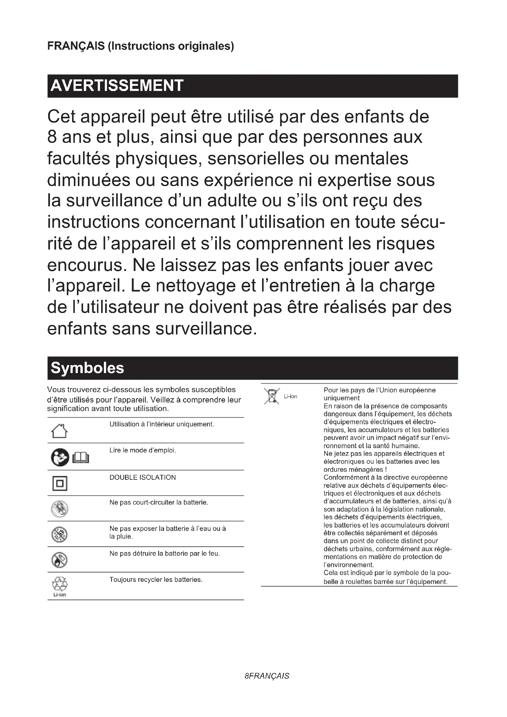 ► Fig.68 FRANÇAIS FRANÇAIS (Instructions originales) AVERTISSEMENT Cet appareil peut être utilisé par des enfants de 8 ans et plus, ainsi que par des personnes aux facultés physiques, sensorielles ou mentales diminuées ou sans expérience ni expertise sous la surveillance d’un adulte ou s’ils ont reçu des instructions concernant l’utilisation en toute sécu- rité de l’appareil et s’ils comprennent les risques encourus. Ne laissez pas les enfants jouer avec l’appareil. Le nettoyage et l’entretien à la charge de l’utilisateur ne doivent pas être réalisés par des enfants sans surveillance. Symboles Vous trouverez ci-dessous les symboles susceptibles d’être utilisés pour l’appareil. Veillez à comprendre leur signication avant toute utilisation. Utilisation à l’intérieur uniquement. Lire le mode d’emploi. DOUBLE ISOLATION Ne pas court-circuiter la batterie. Ne pas exposer la batterie à l’eau ou à la pluie. Ne pas détruire la batterie par le feu. Toujours recycler les batteries. Li-ion Pour les pays de l’Union européenne uniquement En raison de la présence de composants dangereux dans l’équipement, les déchets d’équipements électriques et électro- niques, les accumulateurs et les batteries peuvent avoir un impact négatif sur l’envi- ronnement et la santé humaine. Ne jetez pas les appareils électriques et électroniques ou les batteries avec les ordures ménagères ! Conformément à la directive européenne relative aux déchets d’équipements élec- triques et électroniques et aux déchets d’accumulateurs et de batteries, ainsi qu’à son adaptation à la législation nationale, les déchets d’équipements électriques, les batteries et les accumulateurs doivent être collectés séparément et déposés dans un point de collecte distinct pour déchets urbains, conformément aux régle- mentations en matière de protection de l’environnement. Cela est indiqué par le symbole de la pou- belle à roulettes barrée sur l’équipement.9 FRANÇAIS ► Fig.1 Prêt à charger. Retard de la charge (batterie en cours de refroidissement, batterie trop froide ou en attente de charge). Charge en cours (0 - 80 %). Charge en cours (80 - 100 %). Charge terminée. Charge en cours (Anomalie du refroidissement). Batterie défectueuse. ATTENTION