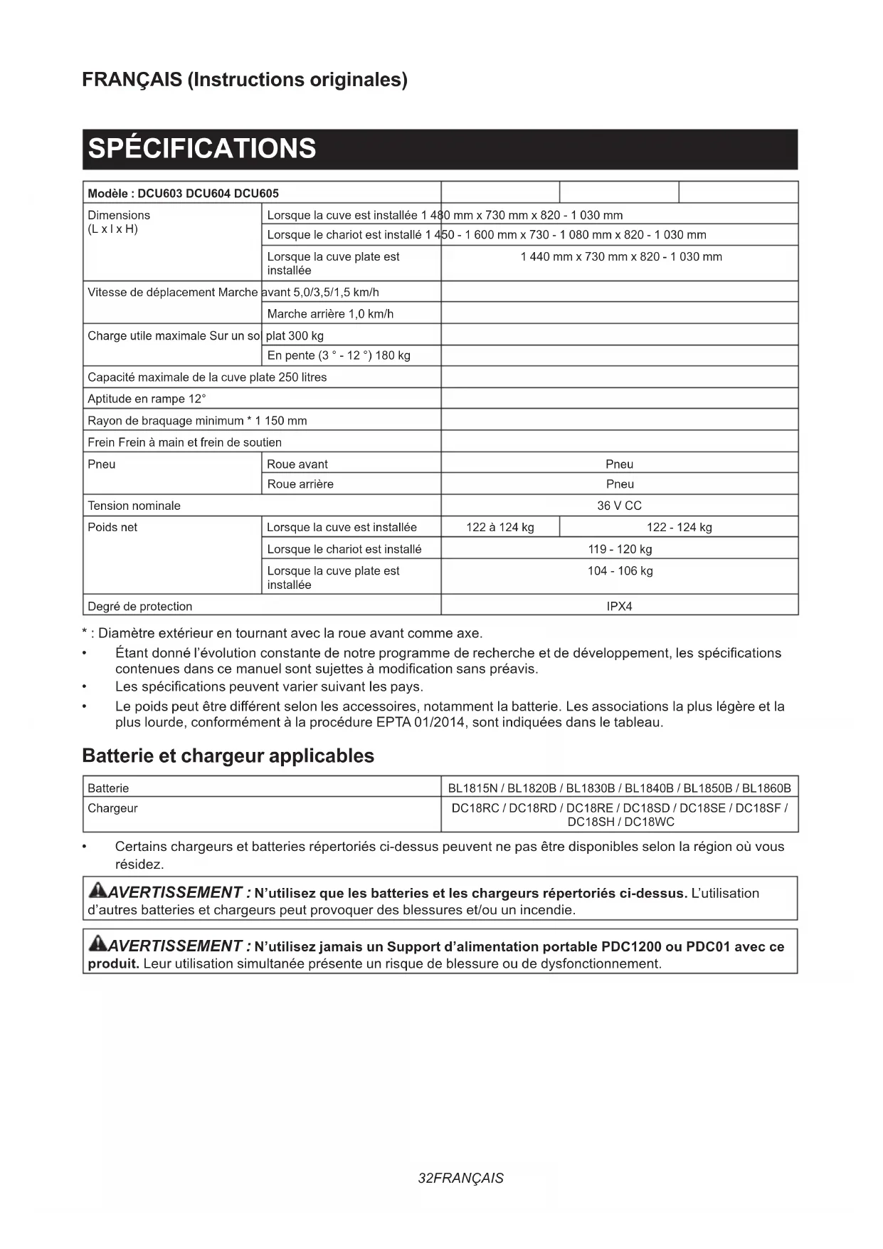 - Makita genuine battery and charger NOTE: Some items in the list may be included in the tool package as standard accessories. They may dier from country to country.32 FRANÇAIS FRANÇAIS (Instructions originales) SPÉCIFICATIONS Modèle : DCU603 DCU604 DCU605 Dimensions (L x l x H) Lorsque la cuve est installée 1 480 mm x 730 mm x 820 - 1 030 mm Lorsque le chariot est installé 1 450 - 1 600 mm x 730 - 1 080 mm x 820 - 1 030 mm Lorsque la cuve plate est installée 1 440 mm x 730 mm x 820 - 1 030 mm Vitesse de déplacement Marche avant 5,0/3,5/1,5 km/h Marche arrière 1,0 km/h Charge utile maximale Sur un sol plat 300 kg En pente (3 ° - 12 °) 180 kg Capacité maximale de la cuve plate 250 litres Aptitude en rampe 12° Rayon de braquage minimum * 1 150 mm Frein Frein à main et frein de soutien Pneu Roue avant Pneu Roue arrière Pneu Tension nominale 36 V CC Poids net Lorsque la cuve est installée 122 à 124 kg 122 - 124 kg Lorsque le chariot est installé 119 - 120 kg Lorsque la cuve plate est installée
