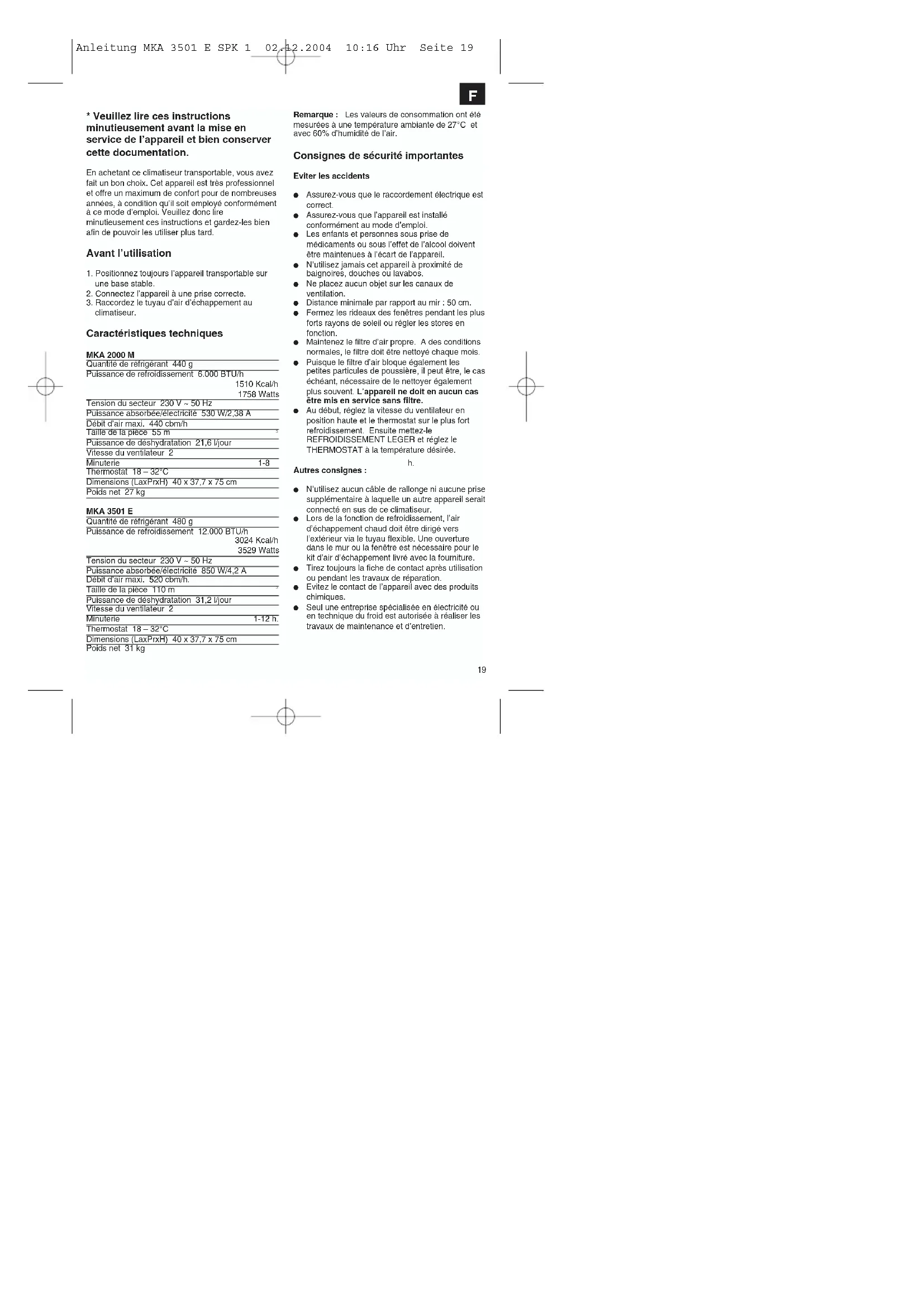 Anleitung MKA 3501 E SPK 1 02.12.2004 10:16 Uhr Seite 18* Veuillez lire ces instructions minutieusement avant la mise en service de l’appareil et bien conserver cette documentation. En achetant ce climatiseur transportable, vous avez fait un bon choix. Cet appareil est très professionnel et offre un maximum de confort pour de nombreuses années, à condition qu’il soit employé conformément à ce mode d’emploi. Veuillez donc lire minutieusement ces instructions et gardez-les bien afin de pouvoir les utiliser plus tard. Avant l’utilisation