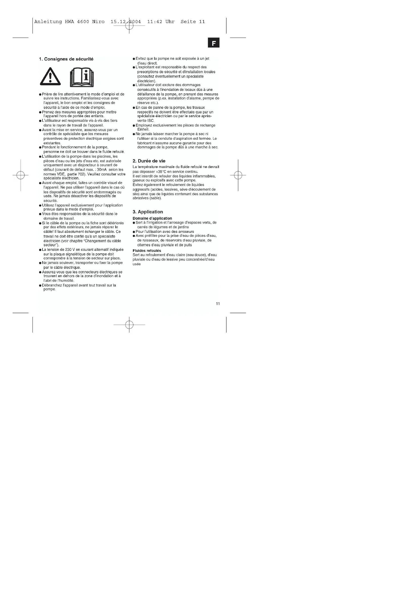 Anleitung HWA 4600 Niro 15.12.2004 11:42 Uhr Seite 1314 tuyau flexible d’aspiration. Ouvrir la conduite d’eau. Mettre la pompe plusieurs fois en circuit pendant env. deux secondes. De cette façon, les bouchages peuvent être éliminés dans la plupart des cas.