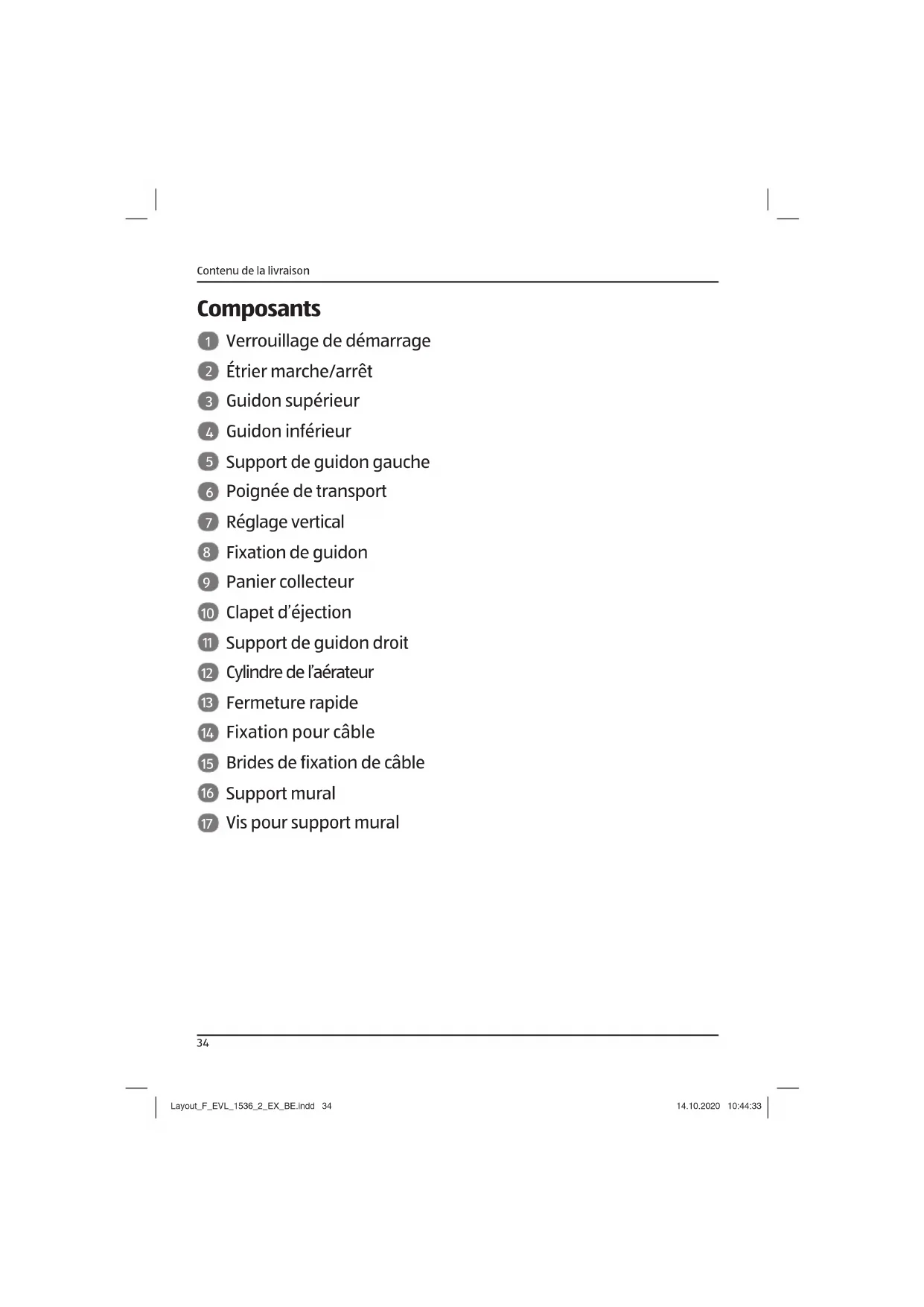 - N’utilisez jamais le câble électrique comme poignée. Portez tou- jours le scarificateur par la poignée de transport. Layout_F_EVL_1536_2_EX_BE.indd 38Layout_F_EVL_1536_2_EX_BE.indd 38 14.10.2020 10:44:3314.10.2020 10:44:3339 Sécurité