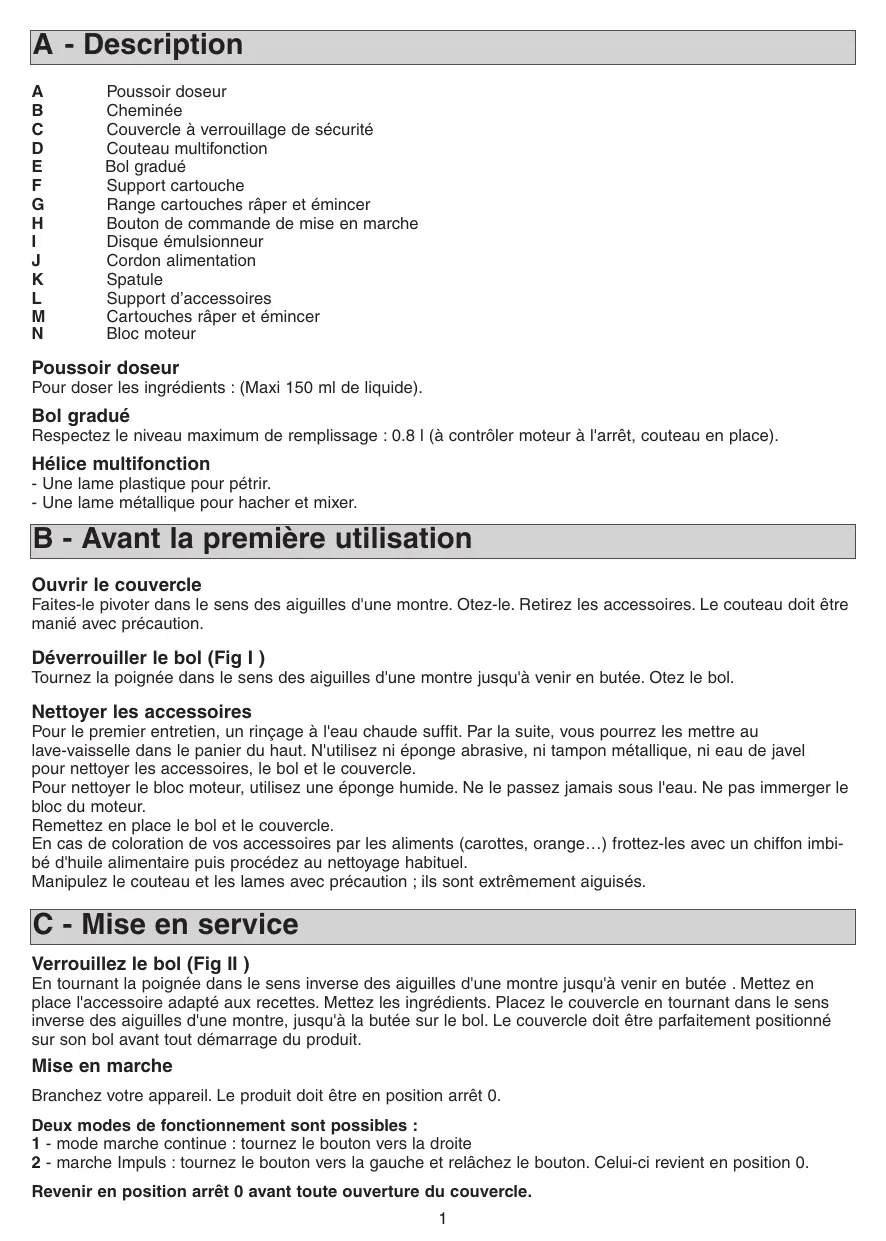 - Utilisez toujours le poussoir (A) pour guider les aliments dans la cheminée, n’introduisez jamais les doigts, fourchette, couteau, spatule ou tout autre objet. - Débranchez la prise de l’appareil après chaque utilisation. - Ne plongez jamais le bloc moteur dans l’eau ou tout autre liquide. Ne le rincez pas non plus. - Ne dépassez pas les quantités maximum ni les durées d’opération indiquées dans le tableau des recettes. - Cet appareil est conforme aux règles techniques et aux normes en vigueur. - Il est conçu pour fonctionner uniquement en courant alternatif. Nous vous demandons avant la première utilisation de vérifier que la tension du réseau correspond bien à celle indiquée sur la plaque signalétique de l’appareil. Tout erreur de branchement annule la garantie. - Ne jamais utiliser ou poser cet appareil sur une plaque chaude ou à proximité d’une flamme (cuisinière à gaz). - N’utilisez le produit que sur un plan de travail stable à l’abri des projections d’eau. - L’ appareil doit être débranché : . s’il y a anomalie pendant le fonctionnement . avant chaque nettoyage ou entretien . après utilisation - Ne débranchez jamais l’appareil en tirant sur le cordon et rangez le cordon autour du range cordon après chaque utilisation. - N’utilisez un prolongateur qu’après avoir vérifié que celui-ci est en parfait état. - Un appareil électroménager ne doit pas être utilisé s’il est tombé par terre. - Si le câble d’alimentation est endommagé, il doit être remplacé par le fabricant, son service après-vente agréé SEB ou une personne de qualification similaire afin d’éviter un danger. - Le produit a été conçu pour un usage domestique, il ne doit en aucun cas être l’objet d’une utilisation professionnelle pour laquelle nous n’engageons ni notre garantie ni notre responsabilité. - Ne pas utiliser le bol comme récipient (congélation, cuisson, stérilisation, micro-onde). - Pour votre sécurité, n'utilisez que des accessoires et des pièces détachées SEB, adaptés à votre appareil. - La plaque signalétique du produit et les principales caractéristiques se trouvent sous l’appareil.