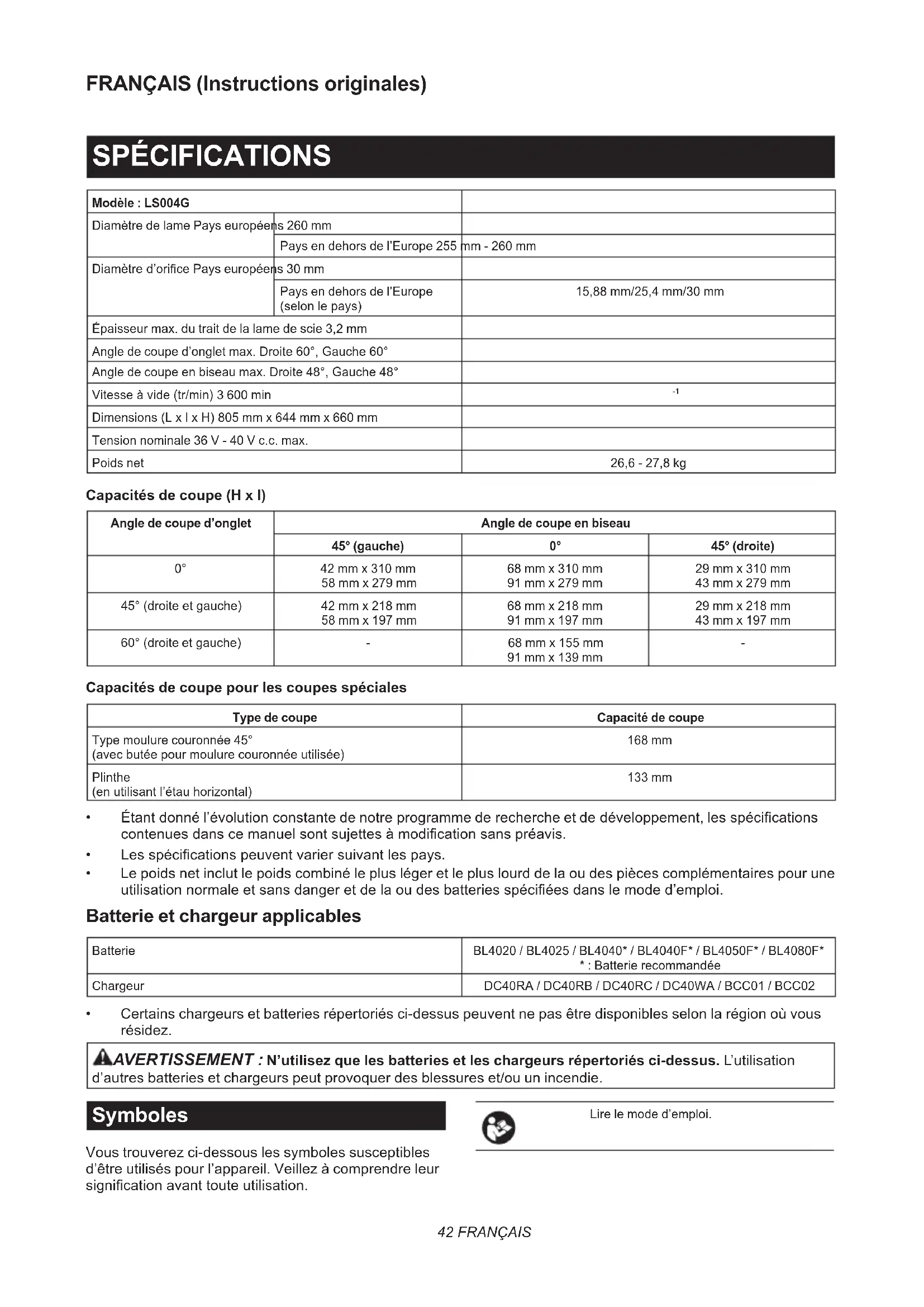 - Makita genuine battery and charger NOTE: Some items in the list may be included in the tool package as standard accessories. They may dier from country to country.42 FRANÇAIS FRANÇAIS (Instructions originales) SPÉCIFICATIONS Modèle : LS004GDiamètre de lame Pays européens 260 mmPays en dehors de l’Europe 255 mm - 260 mmDiamètre d’orice Pays européens 30 mmPays en dehors de l’Europe (selon le pays)15,88 mm/25,4 mm/30 mmÉpaisseur max. du trait de la lame de scie 3,2 mmAngle de coupe d’onglet max. Droite 60°, Gauche 60°Angle de coupe en biseau max. Droite 48°, Gauche 48°Vitesse à vide (tr/min) 3 600 min Dimensions (L x l x H) 805 mm x 644 mm x 660 mmTension nominale 36 V - 40 V c.c. max.Poids net 26,6 - 27,8 kg Capacités de coupe (H x l) Angle de coupe d’onglet Angle de coupe en biseau45° (gauche) 0° 45° (droite)0° 42 mm x 310 mm58 mm x 279 mm68 mm x 310 mm91 mm x 279 mm29 mm x 310 mm43 mm x 279 mm45° (droite et gauche) 42 mm x 218 mm58 mm x 197 mm68 mm x 218 mm91 mm x 197 mm29 mm x 218 mm43 mm x 197 mm 60° (droite et gauche) - 68 mm x 155 mm 91 mm x 139 mm
