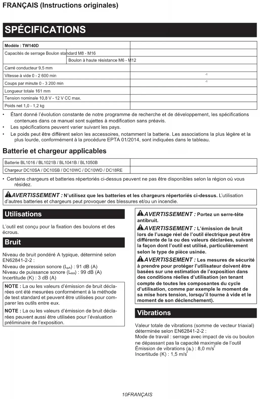 Incertitude(K):1,5m/s 211 FRANÇAIS NOTE : La ou les valeurs de vibration totales décla- rées ont été mesurées conformément à la méthode de test standard et peuvent être utilisées pour com- parer les outils entre eux. NOTE : La ou les valeurs de vibration totales décla- rées peuvent aussi être utilisées pour l’évaluation préliminaire de l’exposition.