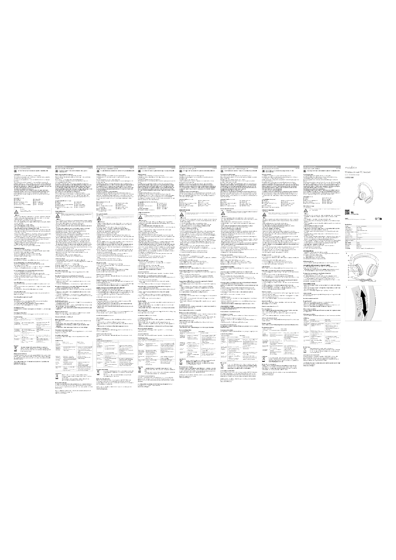 beschadigd.- Het product is niet volledig ingestoken.- Er is geen stroom.- Vervang de USB-C – USB-A-kabel.- Zorg ervoor dat beide uiteinden van de kabel goed zijn ingestoken.- Verander de voedingsbron.AfdankingHet product is bestemd voor gescheiden inzameling bij een hiertoe aangewezen verzamelpunt. Werp het product niet weg bij het huishoudelijk afval.Neem voor meer informatie contact op met de detailhandelaar of de lokale overheid die verantwoordelijk is voor het afvalbeheer.Verklaring van overeenstemmingWij, Nedis B.V. verklaren als fabrikant dat het product CHSTB310BK van ons merk Nedis®, geproduceerd in China, is getest conform alle relevante CE-normen en voorschriften en dat alle tests met succes zijn doorstaan. Dit omvat, maar is niet beperkt tot de richtlijn RED 2014/53/EU.De volledige conformiteitsverklaring (en het blad met veiligheidsgegevens indien van toepassing) kan worden gevonden en gedownload via:nedis.nl/chstb310bk#support Guide de démarrage rapide Casque PC supra-auriculaire sans l CHSTB310BKPour plus d'informations, consultez le manuel détaillé en ligne : ned.is/chstb310bkUtilisation prévueCe produit est un casque supra-auriculaire avec un microphone réglable.Ce produit peut être connecté à deux appareils maximum via une connexion sans l Bluetooth.Le produit est prévu pour un usage intérieur uniquement.Toute modication du produit peut avoir des conséquences sur la sécurité, la garantie et le bon fonctionnement.Ce produit peut être utilisé par des enfants âgés de 8 ans et plus ainsi que des personnes ayant des capacités physiques, sensorielles ou mentales réduites ou manquant d’expérience et de connaissances s’ils sont supervisés ou ont reçu des instructions sur l’utilisation du produit en toute sécurité et comprennent les dangers impliqués. Les enfants ne doivent pas jouer avec le produit. Le nettoyage et la maintenance ne doivent pas être eectués par des enfants sans surveillance.Le produit n’est pas destiné à un usage professionnel.Ce produit est destiné à être utilisé dans des environnements domestiques pour des fonctions de ménage typiques qui peuvent également être réalisées par des utilisateurs non experts pour des fonctions de ménage typiques, tels que : des magasins, bureaux, autres environnements de travail similaires, fermes, par des clients dans des hôtels, motels et autres environnements de type résidentiel et/ou dans des environnements de type chambres d'hôtes.Pièces principales (image A)1 Microphone2 Écouteurs3 Bouton d’augmentation du volume / morceau suivant4 Bouton multifonction5 Bouton de réduction du volume / morceau précédent6 Commutateur de sourdine7 LED d’indication8 Port de charge USB-C9 Adaptateur USB-C –USB-Aq Câble USB-C - USB-AConsignes de sécuritéIcône DescriptionIndication expliquant que le produit peut causer des dommages auditifs. Ne pas écouter à un volume élevé pendant de longues périodes. AVERTISSEMENT