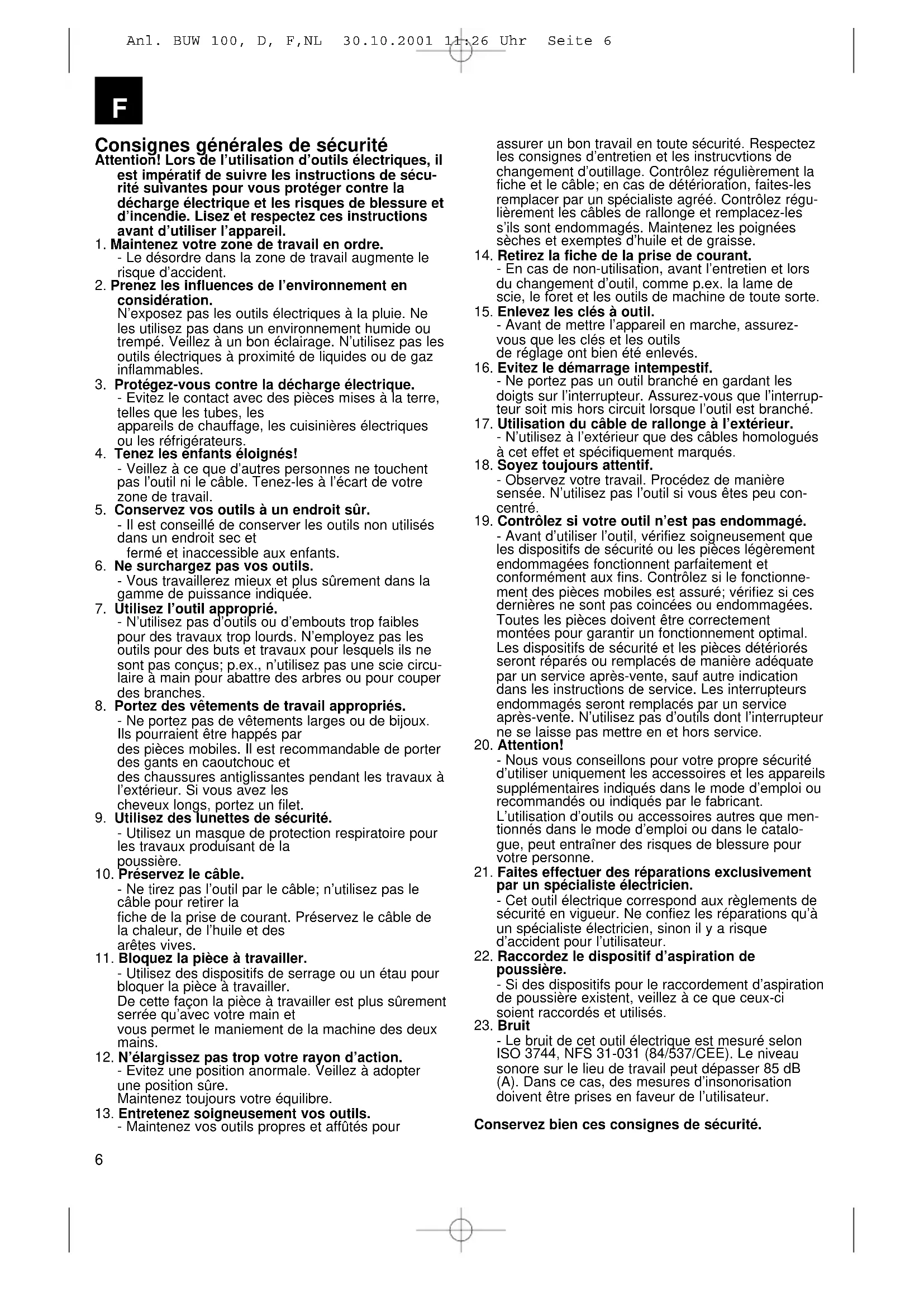 Anl. BUW 100, D, F,NL 30.10.2001 11:26 Uhr Seite 5Consignes générales de sécurité Attention! Lors de l’utilisation d’outils électriques, il est impératif de suivre les instructions de sécu- rité suivantes pour vous protéger contre la décharge électrique et les risques de blessure et d’incendie. Lisez et respectez ces instructions avant d’utiliser l’appareil.