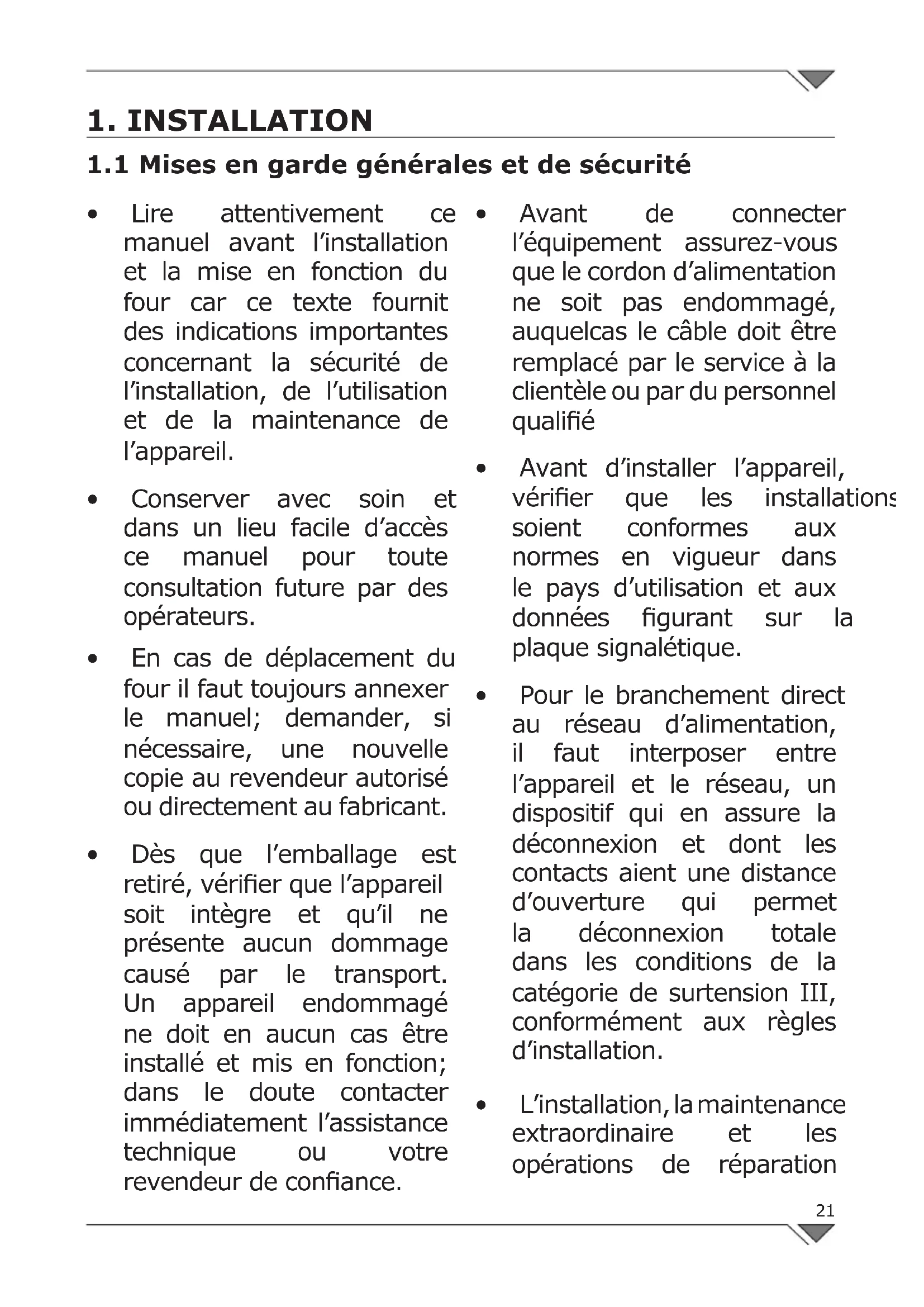 - Lire attentivement ce manuel avant l’installation et la mise en fonction du four car ce texte fournit des indications importantes concernant la sécurité de l’installation, de l’utilisation et de la maintenance de l’appareil