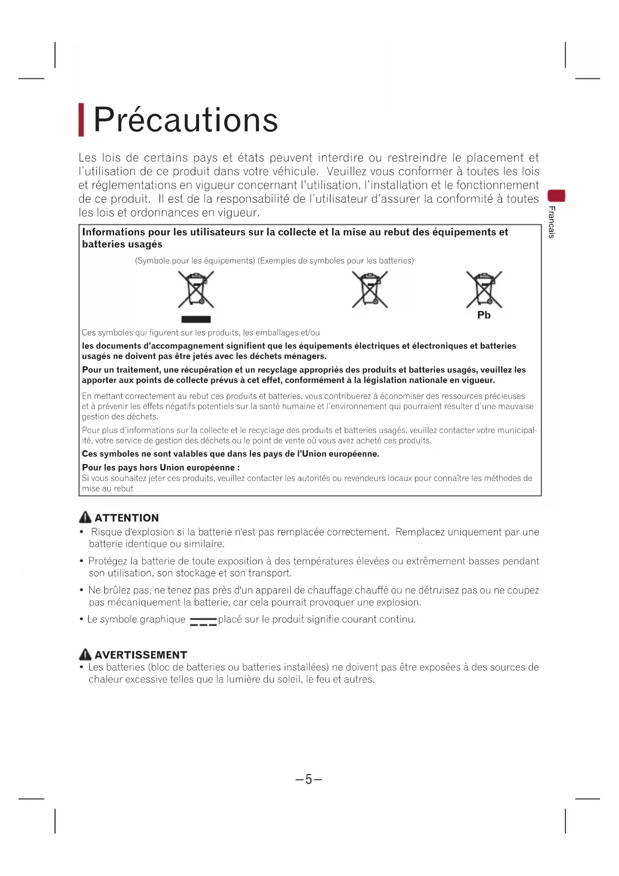 - Do not install this product in places subject to high temperatures or humidity, such as: — Places close to a heater, vent or air conditioner. — Places that may be exposed to rain, such as close to the door or on the vehicle’s floor. Français Précautions de sécurité Les lois de certains pays et états peuvent interdire ou restreindre le placement et l’utilisation de ce produit dans votre véhicule. Veuillez vous conformer à toutes les lois et réglementations en vigueur concernant l’utilisation, l’installation et le fonctionnement de ce produit. Il est de la responsabilité de l’utilisateur d’assurer la conformité à toutes les lois et ordonnances en vigueur. AVERTISSEMENT• N’installez pas ce produit dans votre véhicule si son emplacement ou son utilisation risque de gêner la visibilité du conducteur sur la route ou le fonctionnement des airbags du véhicule. Il est également de la responsabilité du conducteur de connaître et de respecter les lois, les règles et les réglementations du lieu de conduite, y compris le droit à la vie privée des passagers par exemple, et de ne pas utiliser l’appareil dans un endroit où son installation ou son utilisation est interdite. AVERTISSEMENT