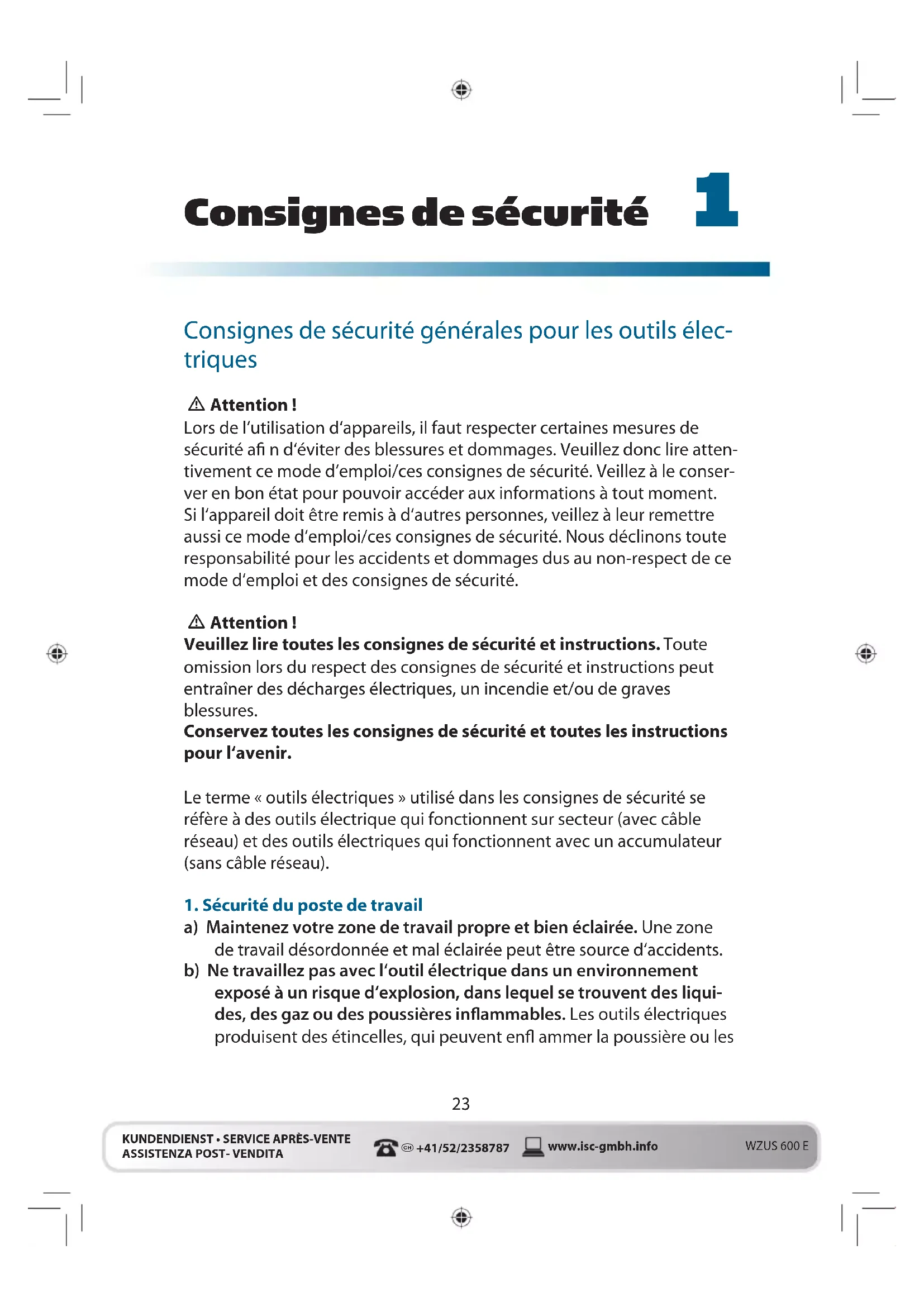 +41/52/2358787 www.isc-gmbh.info WZUS 600 E Consignes de sécurité générales pour les outils élec- triques Attention ! Lors de l‘utilisation d‘appareils, il faut respecter certaines mesures de sécurité a n d‘éviter des blessures et dommages. Veuillez donc lire atten- tivement ce mode d‘emploi/ces consignes de sécurité. Veillez à le conser- ver en bon état pour pouvoir accéder aux informations à tout moment. Si l‘appareil doit être remis à d‘autres personnes, veillez à leur remettre aussi ce mode d‘emploi/ces consignes de sécurité. Nous déclinons toute responsabilité pour les accidents et dommages dus au non-respect de ce mode d‘emploi et des consignes de sécurité. Attention ! Veuillez lire toutes les consignes de sécurité et instructions. Toute omission lors du respect des consignes de sécurité et instructions peut entraîner des décharges électriques, un incendie et/ou de graves blessures. Conservez toutes les consignes de sécurité et toutes les instructions pour l‘avenir. Le terme « outils électriques » utilisé dans les consignes de sécurité se réfère à des outils électrique qui fonctionnent sur secteur (avec câble réseau) et des outils électriques qui fonctionnent avec un accumulateur (sans câble réseau).