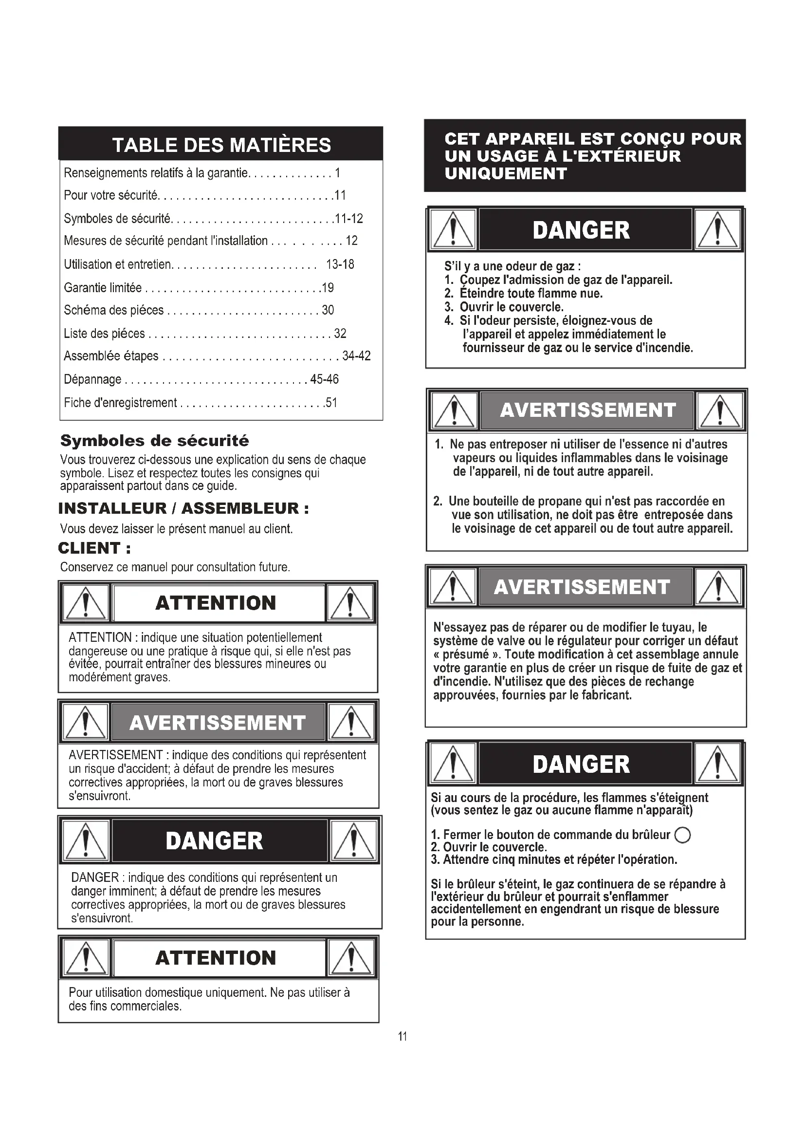 danger imminent; à défaut de prendre les mesures correctives appropriées, la mort ou de graves blessures s'ensuivront. DANGER INSTALLEUR / ASSEMBLEUR : Vous devez laisser le présent manuel au client. CLIENT : Conservez ce manuel pour consultation future. N'essayez pas de réparer ou de modifier le tuyau, le système de valve ou le régulateur pour corriger un défaut « présumé ». Toute modification à cet assemblage annule votre garantie en plus de créer un risque de fuite de gaz et d'incendie. N'utilisez que des pièces de rechange approuvées, fournies par le fabricant. AVERTISSEMENT ATTENTION Pour utilisation domestique uniquement. Ne pas utiliser à des fins commerciales.