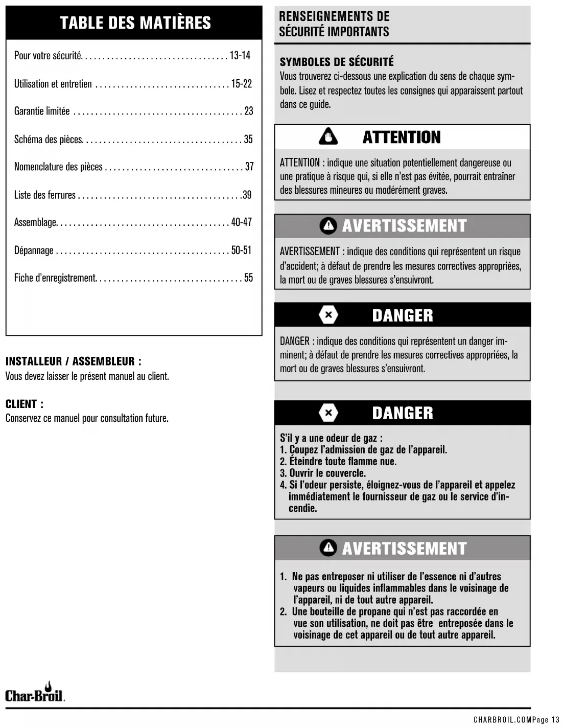 - -51 Fiche d’enregistrement CHARBROIL.COMPage 14 POUR VOTRE SÉCURITÉ – INSTALLATION DE VOTRE GRIL ATTENTION DANGER Pour utilisation domestique uniquement. Ne pas utiliser à des fins commerciales. Lire et respecter toutes les consignes de sécurité, les instructions d’assemblage et les directives d’emploi et d’entretien avant d’essayer d’assembler cet appareil ou de l’utiliser pour la cuisson. Certaines pièces peuvent être munies de bords coupantsl. Portez des gants de protection au besoin. Incendies de Graisse p. 55