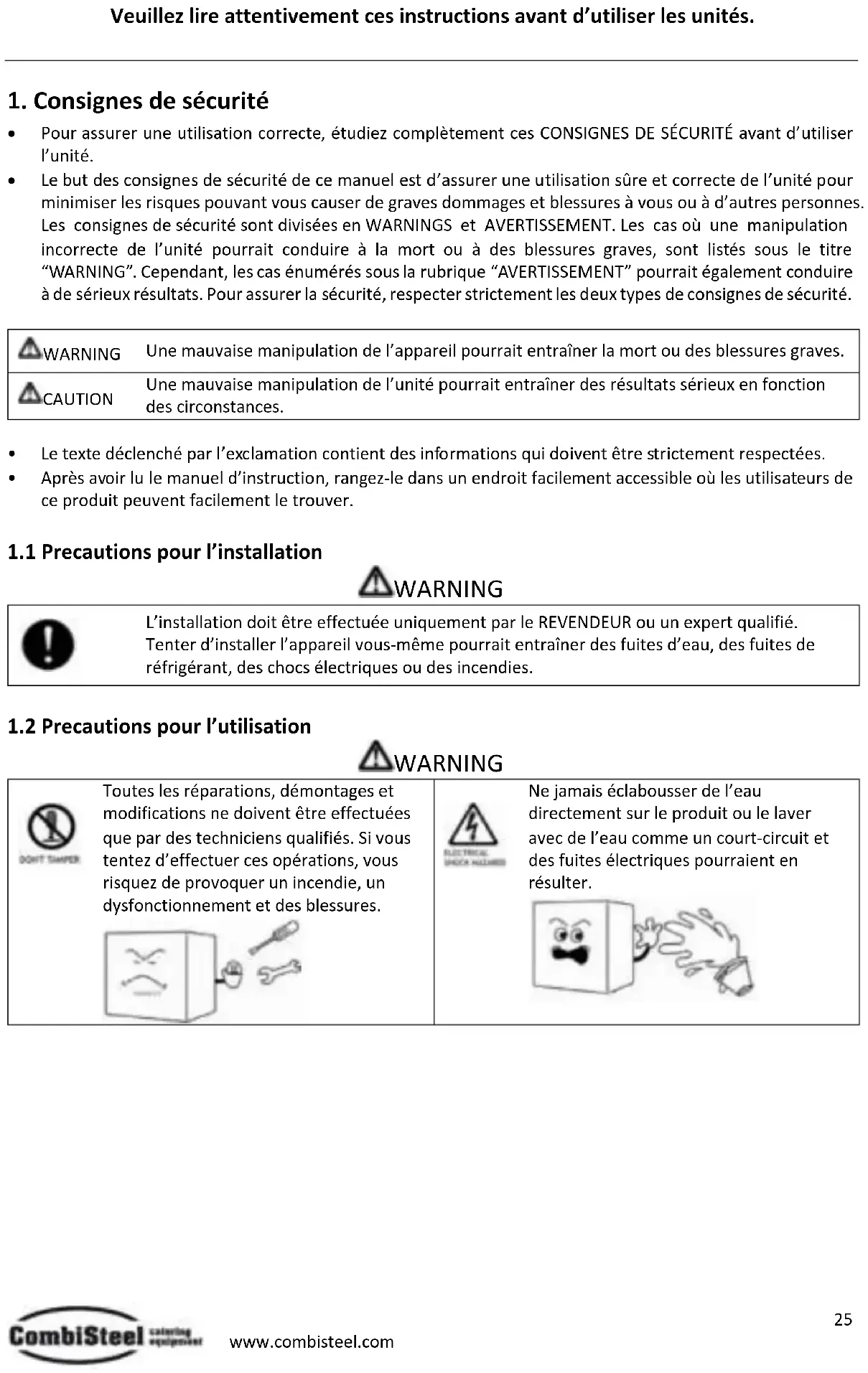 Ne jamais éclabousser de l’eau directement sur le produit ou le laver avec de l’eau comme un court-circuit et des fuites électriques pourraient en résulter.26 www.combisteel.com
