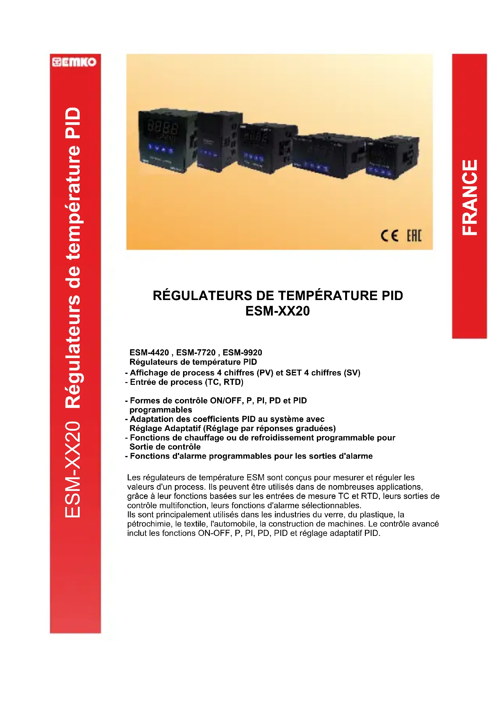 Régulateurs de température PID - Affichage de process 4 chiffres (PV) et SET 4 chiffres (SV) - Entrée de process (TC, RTD) - Formes de contrôle ON/OFF, P, PI, PD et PID programmables - Adaptation des coefficients PID au système avec Réglage Adaptatif (Réglage par réponses graduées) - Fonctions de chauffage ou de refroidissement programmable pour Sortie de contrôle - Fonctions d'alarme programmables pour les sorties d'alarme Les régulateurs de température ESM sont conçus pour mesurer et réguler les valeurs d'un process. Ils peuvent être utilisés dans de nombreuses applications, grâce à leur fonctions basées sur les entrées de mesure TC et RTD, leurs sorties de contrôle multifonction, leurs fonctions d'alarme sélectionnables. Ils sont principalement utilisés dans les industries du verre, du plastique, la pétrochimie, le textile, l'automobile, la construction de machines. Le contrôle avancé inclut les fonctions ON-OFF, P, PI, PD, PID et réglage adaptatif PID.FRANCE AFFICHAGE Affichage de process : ESM-4420 : 10,1 mm Afficheur à LED rouges 4 chiffres ESM-7720 : 13,2 mm Afficheur à LED rouges 4 chiffres ESM-9920 : 19 mm Afficheur à LED rouges 4 chiffres Affichage des valeurs de consigne : ESM-4420 : 8 mm Affichage LED verts à 4 chiffres ESM-7720 : 9,1 mm Affichage LED verts à 4 chiffres ESM-9920 : 10,8 mm Affichage LED verts à 4 chiffres LED : PS (valeur de consigne du process), PO (LED État sortie du process) , AS1, AS2 (valeurs de consigne d'alarme), AO1, AO2 (LED États sortie d'alarme), LED °C , °F SPÉCIFICATIONS Entrée de Process : TC, RTD Thermocouple (TC) : J, K, R, S ve T (IEC584.1)(ITS90) Thermorésistance (RTD) : PT-100 (IEC751)(ITS90) Plage de mesure : Veuillez consulter le tableau 1 pour sélectionner l'échelle et le type d'entrée. Précision : ±0,25% à pleine échelle pour thermocouple et thermorésistance Compensation de soudure froide : Automatiquement ± 0,1°C/ 1°C. Compensation de ligne : Maximum 10Ohm Protection de coupure de capteur : Excellente Cycle d'échantillonnage : 3 échantillons par seconde Filtre d'entrée : 1,0 seconde. Forme de contrôle : ON/OFF, P, PI, PD ou PID (forme de contrôle programmable par l'utilisateur) SORTIES Sortie Process : Relais (5A@250V sur charge résistive) ou Pilote de sortie V SSR (Maximum 24mA, Max. 12V ) Sortie d'alarme : Relais (5A@250V sur charge résistive) ou Pilote de sortie V SSR (Sortie d'alarme 2) (Maximum 24mA, Max. 12V ) TENSION D'ALIMENTATION (À spécifier dans la commande)