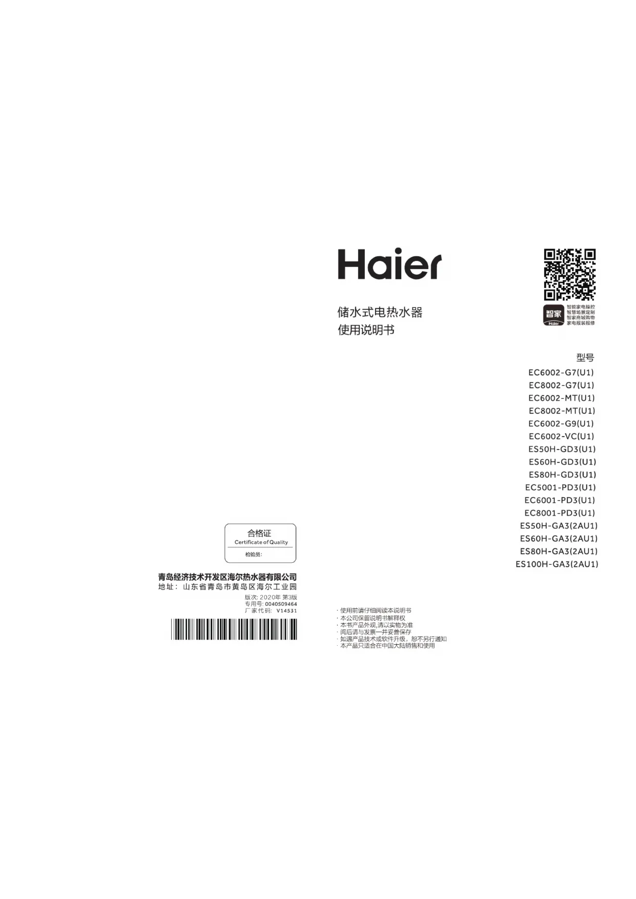EC8001-PD3(U1) - Chaudière HAIER - Notice d'utilisation et mode d'emploi gratuit