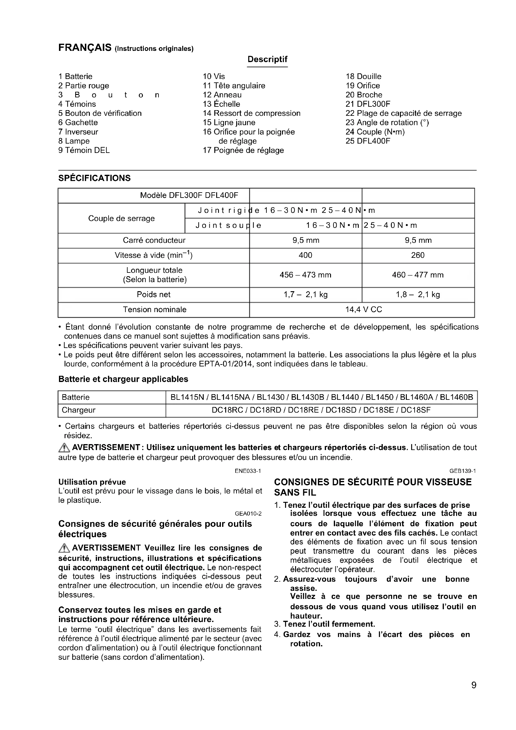 For European countries only The EC declaration of conformity is included as Annex A to this instruction manual.9 FRANÇAIS (Instructions originales) Descriptif 1 Batterie 2 Partie rouge 3Bouton 4 Témoins 5 Bouton de vérification 6 Gachette 7 Inverseur 8 Lampe 9 Témoin DEL 10 Vis 11 Tête angulaire 12 Anneau 13 Échelle 14 Ressort de compression 15 Ligne jaune 16 Orifice pour la poignée de réglage 17 Poignée de réglage 18 Douille 19 Orifice 20 Broche 21 DFL300F 22 Plage de capacité de serrage 23 Angle de rotation (°) 24 Couple (N•m) 25 DFL400F SPÉCIFICATIONS