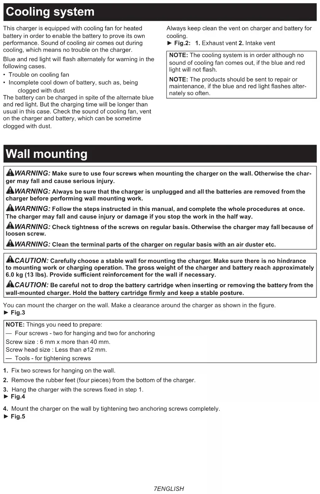 poussières, etc. ATTENTION : Choisissez soigneusement un mur stable pour le montage du chargeur. Assurez-vous que la tâche de montage ou la charge ne sont pas entravées. Le poids brut de l’ensemble chargeur et batterie est d’environ 6,0 kg (13 lbs). Prévoyez de renforcer susamment le mur si nécessaire. ATTENTION : Faites attention de ne pas laisser tomber la batterie lorsque vous insérez ou retirez la batterie du chargeur mural. Tenez fermement la batterie et gardez une posture stable. Vous pouvez installer le chargeur au mur. Prévoyez un espace autour du chargeur comme illustré sur la gure. ► Fig.3 NOTE : Éléments à préparer : — Quatre vis - deux pour suspension et deux pour xation Taille de vis : 6 mm x plus de 40 mm. Taille de tête de vis : moins de ø12 mm. — Outils - pour serrer les vis