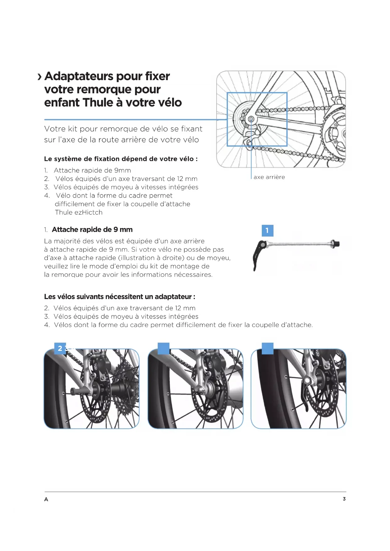 difficilement de fixer la coupelle d’attache Thule ezHictch La majorité des vélos est équipée d’un axe arrière àattache rapide de 9mm. Si votre vélo ne possède pas d’axe àattache rapide (illustration à droite) ou de moyeu, veuillezlire le mode d’emploi du kit de montage de laremorque pour avoir les informations nécessaires.