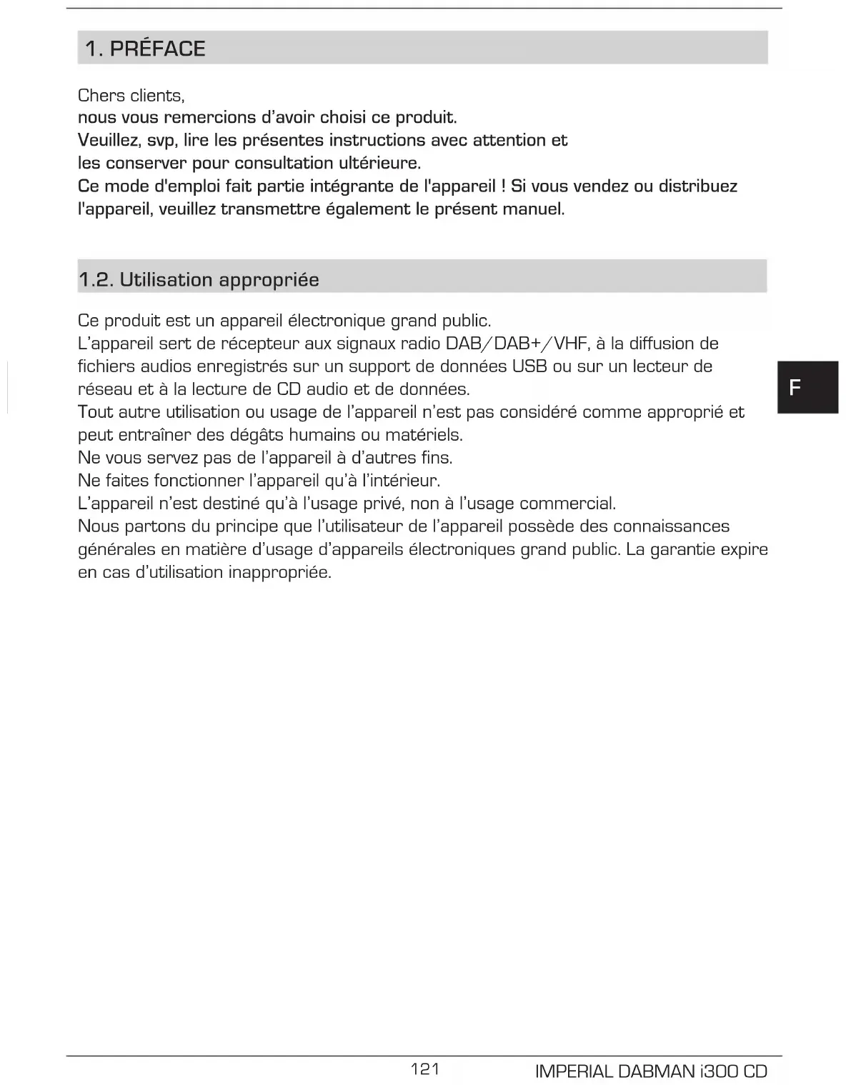 Chers clients, nous vous remercions d’avoir choisi ce produit. Veuillez, svp, lire les présentes instructions avec attention et les conserver pour consultation ultérieure. Ce mode d'emploi fait partie intégrante de l'appareil ! Si vous vendez ou distribuez l'appareil, veuillez transmettre également le présent manuel. 1.2. Utilisation appropriée Ce produit est un appareil électronique grand public. L’appareil sert de récepteur aux signaux radio DAB/DAB+/VHF, à la diffusion de fichiers audios enregistrés sur un support de données USB ou sur un lecteur de réseau et à la lecture de CD audio et de données. Tout autre utilisation ou usage de l’appareil n’est pas considéré comme approprié et peut entraîner des dégâts humains ou matériels. Ne vous servez pas de l’appareil à d’autres fins. Ne faites fonctionner l’appareil qu’à l’intérieur. L’appareil n’est destiné qu’à l’usage privé, non à l’usage commercial. Nous partons du principe que l’utilisateur de l’appareil possède des connaissances générales en matière d’usage d’appareils électroniques grand public. La garantie expire en cas d’utilisation inappropriée.122 Mode d‘emploi