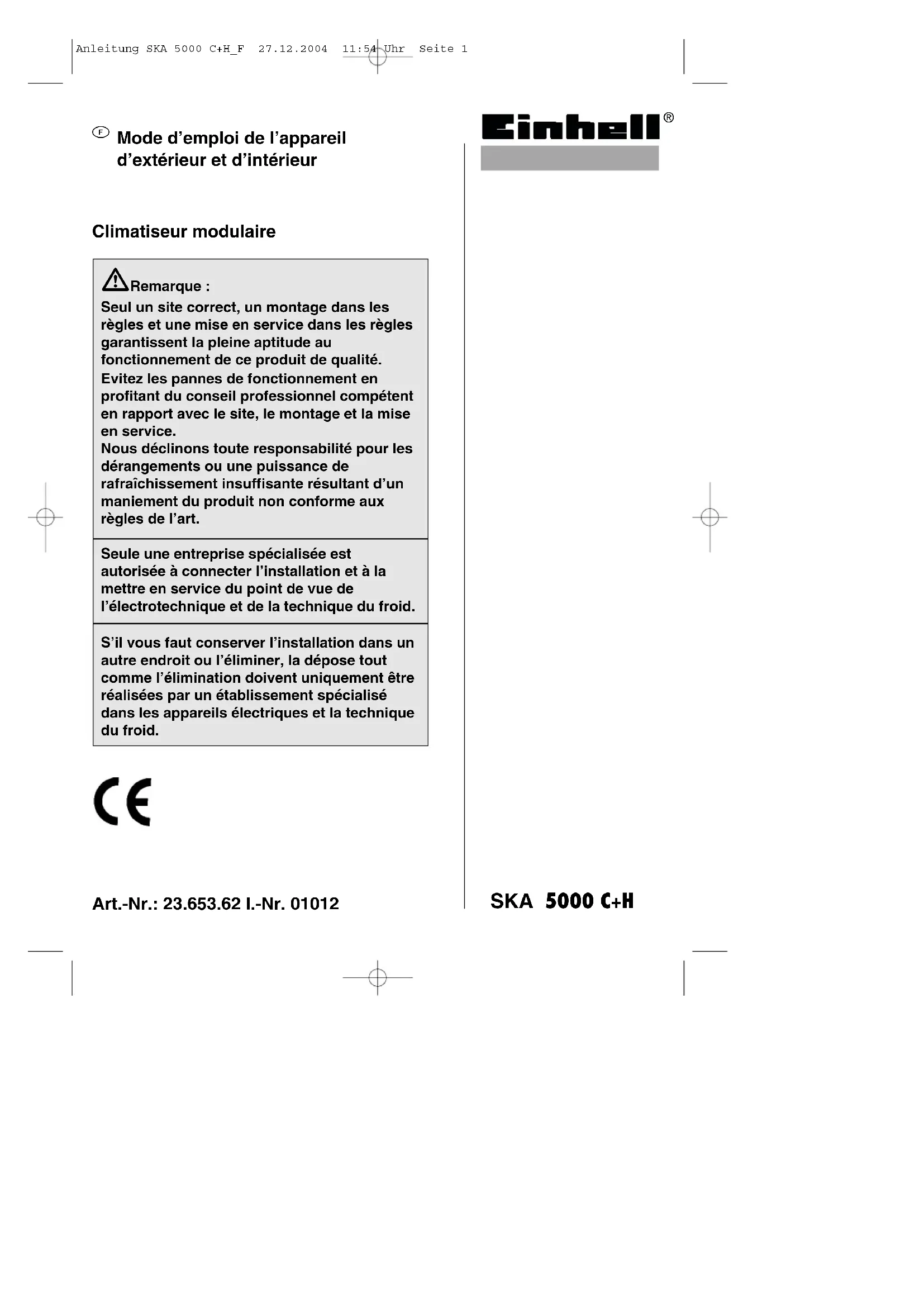 SKA 5000 C+H - Climatisation EINHELL - Notice d'utilisation et mode d'emploi gratuit