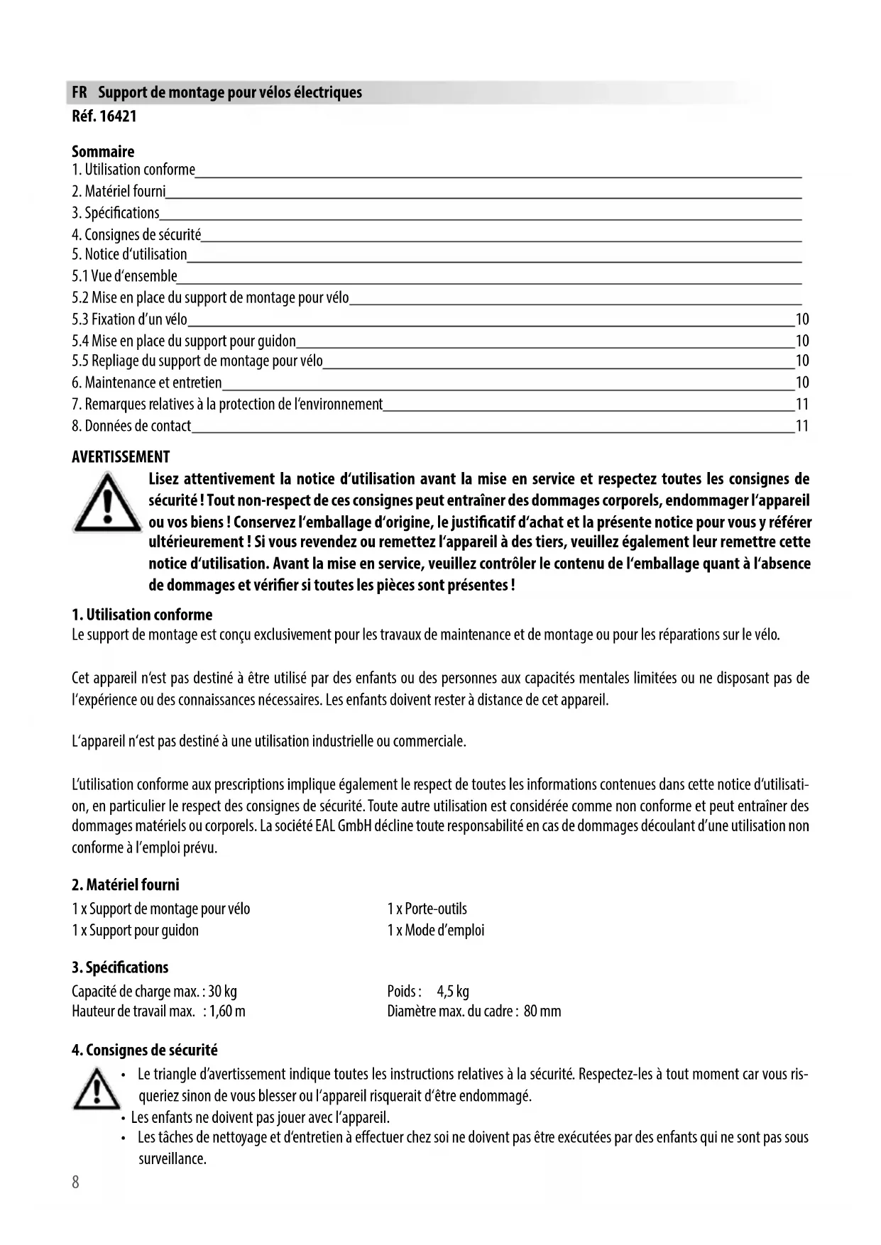 Le support de montage est conçu exclusivement pour les travaux de maintenance et de montage ou pour les réparations sur le vélo. Cet appareil n‘est pas destiné à être utilisé par des enfants ou des personnes aux capacités mentales limitées ou ne disposant pas de l‘expérience ou des connaissances nécessaires. Les enfants doivent rester à distance de cet appareil. L‘appareil n‘est pas destiné à une utilisation industrielle ou commerciale. L‘utilisation conforme aux prescriptions implique également le respect de toutes les informations contenues dans cette notice d‘utilisati- on, en particulier le respect des consignes de sécurité. Toute autre utilisation est considérée comme non conforme et peut entraîner des dommages matériels ou corporels. La société EAL GmbH décline toute responsabilité en cas de dommages découlant d’une utilisation non conforme à l’emploi prévu.