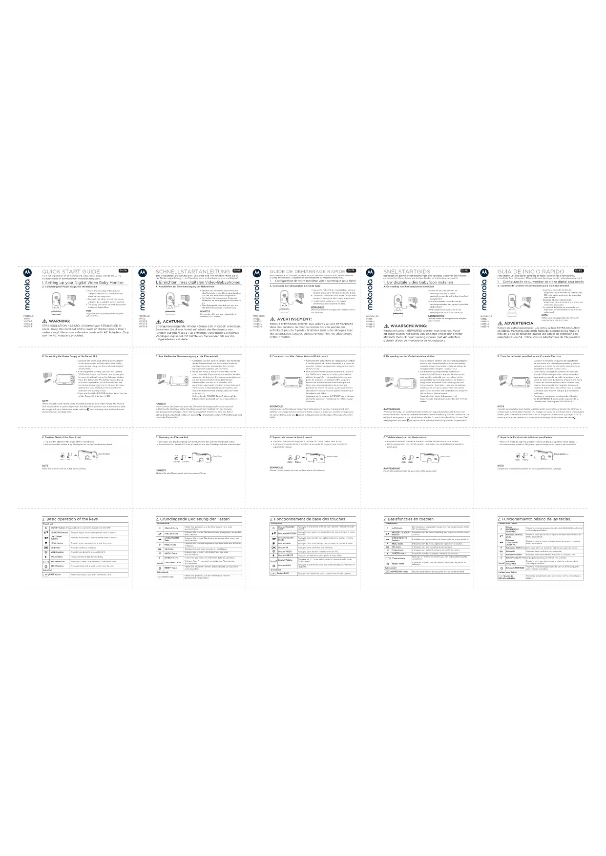 RISQUE D'ÉTRANGLEMENT. Des enfants se sont ÉTRANGLÉS dans des cordons. Gardez ce cordon hors de portée des enfants (à plus de 3 pieds). N'utilisez jamais de rallonges avec des adaptateurs secteur. Utilisez uniquement les adaptateurs secteur fournis. B. Connexion du câble d'alimentation à l'Unité parent• Connectez la petite fiche de l'adaptateur secteurà l'unité parent et l'autre extrémité à la prise decourant. Utilisez uniquement l'adaptateur fourni(5VDC/1.0A).• Une batterie rechargeable (batterie au lithium-ion 2000mAh) permet à l'unité parent d'êtreutilisée lorsqu'elle n'est pas branchée sur uneprise de courant. La batterie offre jusqu'à 5heures de fonctionnement de l'unité parent.Nous vous recommandons de le chargerpendant au moins 16 heures avant la premièreutilisation et lorsque l'unité parent indique quela batterie est faible.• Appuyez sur le bouton POWER sur le dessusde l'unité parent et maintenez-le enfoncé pourl'allumer.REMARQUE Lorsque les unités bébé et parent sont allumées et à portée, l'unité parent doit afficher une image couleur de l'unité bébé, mais si la pièce est sombre, l'image sera en noir et blanc, avec une icône indiquant, due à l'éclairage infrarouge de l'unité bébé.EU NL SNELSTARTGIDS Raadpleeg de gebruikershandleiding voor een volledige uitleg van alle functies en instructies. (beschikbaar om te downloaden op motorolanursery.com).