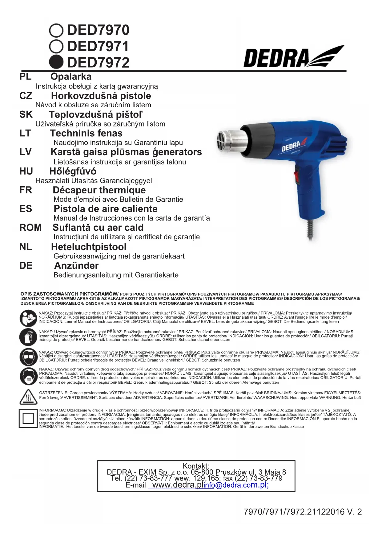 Déclaration de conformité se trouve dans le siège du fabricant Dedra-Exim sp. z o.o. Règlement du sécurité du travail - brochure jointe à l'appareil