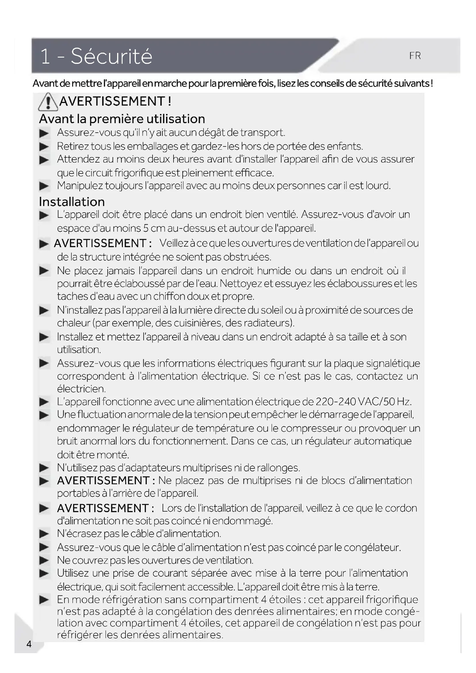 Lors de l’installation de l'appareil, veillez à ce que le cordon d'alimentation ne soit pas coincé ni endommagé. N’écrasez pas le câble d’alimentation. Assurez-vous que le câble d’alimentation n’est pas coincé par le congélateur. Ne couvrez pas les ouvertures de ventilation. Utilisez une prise de courant séparée avec mise à la terre pour l’alimentation électrique, qui soit facilement accessible. L’appareil doit être mis à la terre. En mode réfrigération sans compartiment 4 étoiles : cet appareiOIULJRULƪTXH réfrigérer les denrées alimentaires. lation avec compartiment 4 étoiles, cet appareil de congélation n’est pas pour n’est pas adapté à la congélation des denrées alimentaires; en mode congé-5
