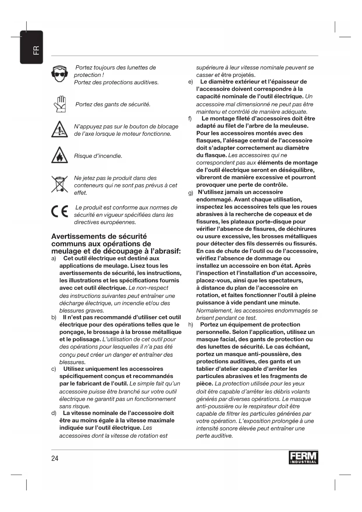 Portez toujours des lunettes de protection ! Portez des protections auditives. Portez des gants de sécurité. N’appuyez pas sur le bouton de blocage de l’axe lorsque le moteur fonctionne. Risque d’incendie. Ne jetez pas le produit dans des conteneurs qui ne sont pas prévus à cet effet. Le produit est conforme aux normes de sécurité en vigueur spécifiées dans les directives européennes. Avertissements de sécurité communs aux opérations de meulage et de découpage à l’abrasif: a) Cet outil électrique est destiné aux applications de meulage. Lisez tous les avertissements de sécurité, les instructions, les illustrations et les spécifications fournis avec cet outil électrique. Le non-respect des instructions suivantes peut entraîner une décharge électrique, un incendie et/ou des blessures graves. b) Il n’est pas recommandé d’utiliser cet outil électrique pour des opérations telles que le ponçage, le brossage à la brosse métallique et le polissage. L’utilisation de cet outil pour des opérations pour lesquelles il n’a pas été conçu peut créer un danger et entraîner des blessures. c) Utilisez uniquement les accessoires spécifiquement conçus et recommandés par le fabricant de l’outil. Le simple fait qu’un accessoire puisse être branché sur votre outil électrique ne garantit pas un fonctionnement sans risque. d) La vitesse nominale de l’accessoire doit être au moins égale à la vitesse maximale indiquée sur l’outil électrique. Les accessoires dont la vitesse de rotation est supérieure à leur vitesse nominale peuvent se casser et être projetés. e) Le diamètre extérieur et l’épaisseur de l’accessoire doivent correspondre à la capacité nominale de l’outil électrique. Un accessoire mal dimensionné ne peut pas être maintenu et contrôlé de manière adéquate. f) Le montage fileté d’accessoires doit être adapté au filet de l’arbre de la meuleuse. Pour les accessoires montés avec des flasques, l’alésage central de l’accessoire doit s’adapter correctement au diamètre du flasque. Les accessoires qui ne correspondent pas aux éléments de montage de l’outil électrique seront en déséquilibre, vibreront de manière excessive et pourront provoquer une perte de contrôle.