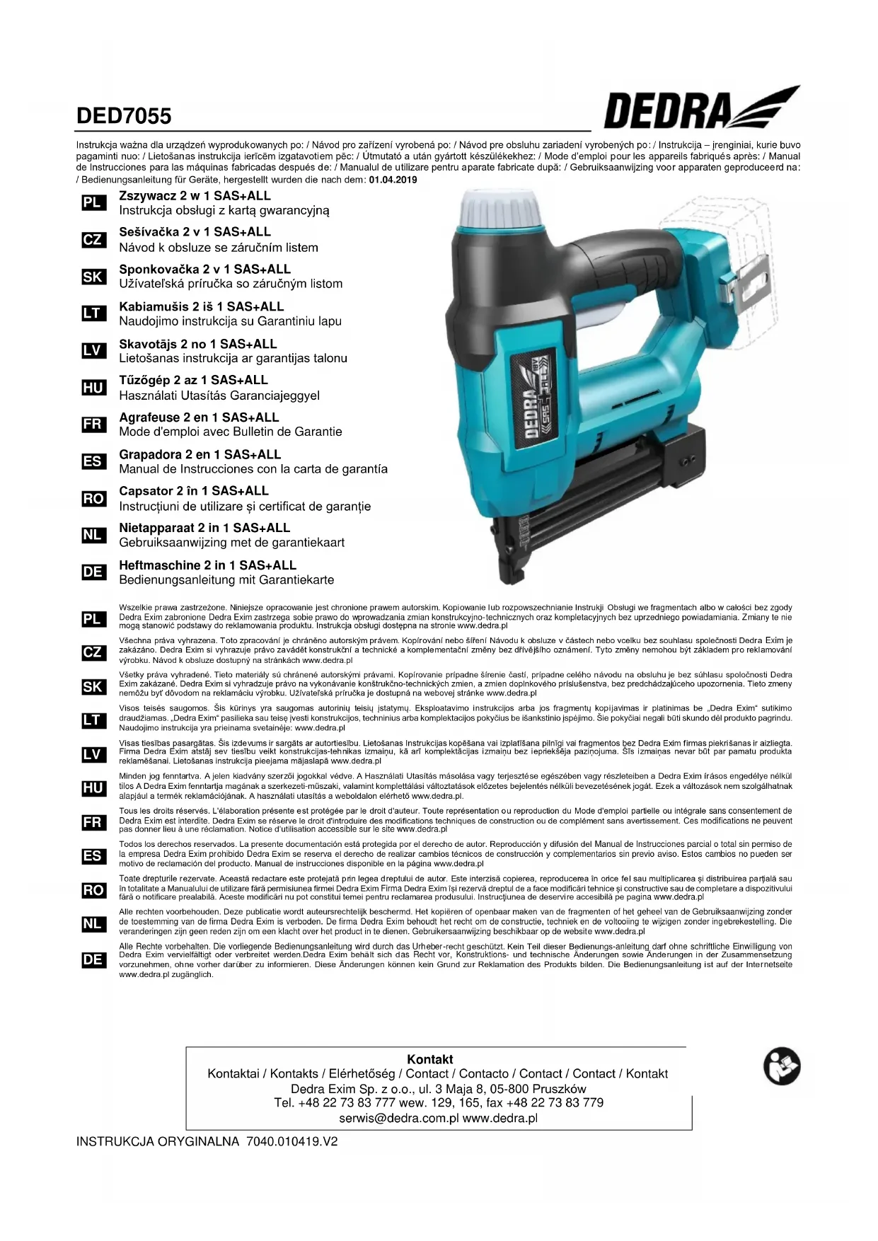 L’agrafeuse 18V DED7055 de la ligne SAS+ALL peut être équipée de chaque accumulateur et chargeur de la ligne SAS+ALL. Les pièces de rechange et les accessoires ne constituent pas la complétion de l’appareil, il est possible de les acheter A536015 (clous 15 mm) A536020 (clous 20 mm) A536025 (clous 25 mm) A536030 (clous 30 mm) A566116 (agrafes 5,7 x 16 mm) A536118 (agrafes 5,7 x 18 mm) A536120 (agrafes 5,7 x 20 mm) A536121 (agrafes 5,7 x 21 mm) A536125 (agrafes 5,7 x 25 mm) Afin d’acheter les pièces de rechange et les accessoires, il faut prendre contact avec le Service Dedra-Exim. Les données de contact se trouvent à la première page de la notice d’utilisation. En faisant la commande des pièces, veuillez indiquer le numéro de LOT placé sur la plaque signalétique et le numéro de pièce du dessin de montage. Durant la période de garantie, les réparations sont faites selon les principes présentés dans la Carte de Garantie. Veuillez transmettre le produit au dépannage dans le lieu d’achat (le vendeur est obligé à recevoir le produit reclamé) ou l’envoyer au Service Central DEDRA-EXIM. Veuillez bien joindre la carte de garantie délivrée par l’importateur. A défaut de ce document, la réparation sera traitée d’après-vente. La période de garantie expirée, le Service Central fait les réparations. Il faut envoyer le produit endommagé au Service (les frais d’envoi chargent l’utilisateur).