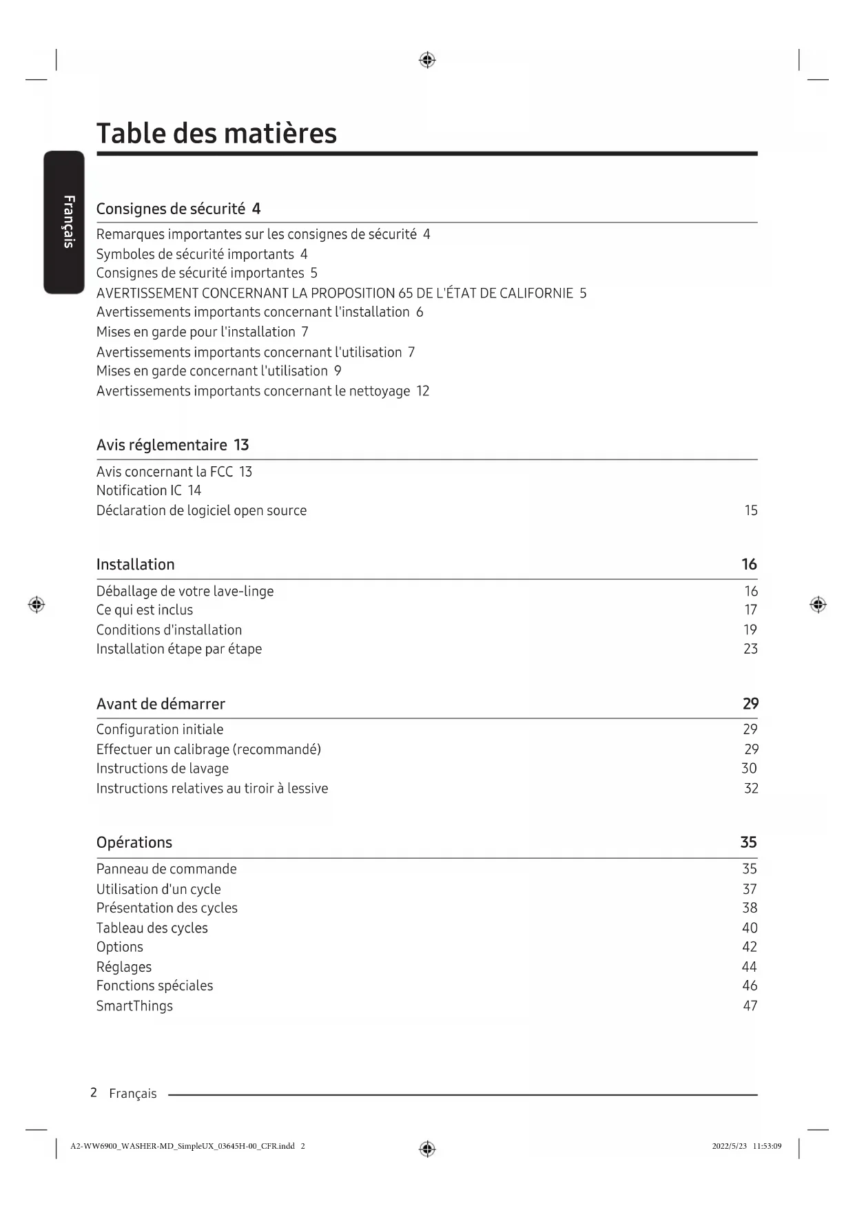 Table des matières Consignes de sécurité 4 Remarques importantes sur les consignes de sécurité 4 Symboles de sécurité importants 4 Consignes de sécurité importantes 5 AVERTISSEMENT CONCERNANT LA PROPOSITION 65 DE L'ÉTAT DE CALIFORNIE 5 Avertissements importants concernant l'installation 6 Mises en garde pour l'installation 7 Avertissements importants concernant l'utilisation 7 Mises en garde concernant l'utilisation 9 Avertissements importants concernant le nettoyage 12 Avis réglementaire 13 Avis concernant la FCC 13 Notification IC 14 Déclaration de logiciel open source 15 Installation 16 Déballage de votre lave-linge 16 Ce qui est inclus 17 Conditions d'installation 19 Installation étape par étape 23 Avant de démarrer 29 Configuration initiale 29 Effectuer un calibrage (recommandé) 29 Instructions de lavage 30 Instructions relatives au tiroir à lessive 32 Opérations 35 Panneau de commande 35 Utilisation d'un cycle 37 Présentation des cycles 38 Tableau des cycles 40 Options 42 Réglages 44 Fonctions spéciales 46 SmartThings 47 A2-WW6900_WASHER-MD_SimpleUX_03645H-00_CFR.indd 2 2022/5/23 11:53:09Français Français