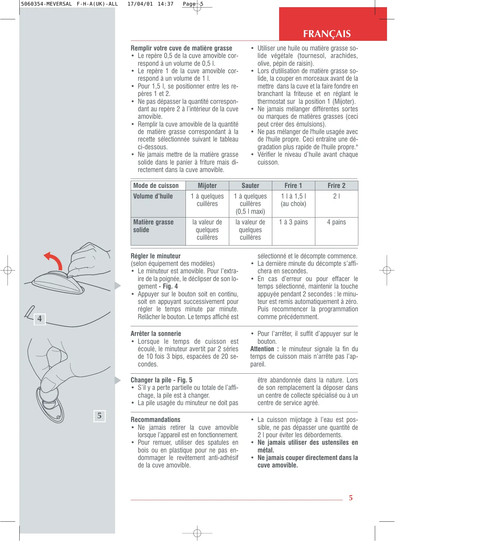17/04/01 14:37 Page 5 FRANÇAIS Remplir votre cuve de matière grasse