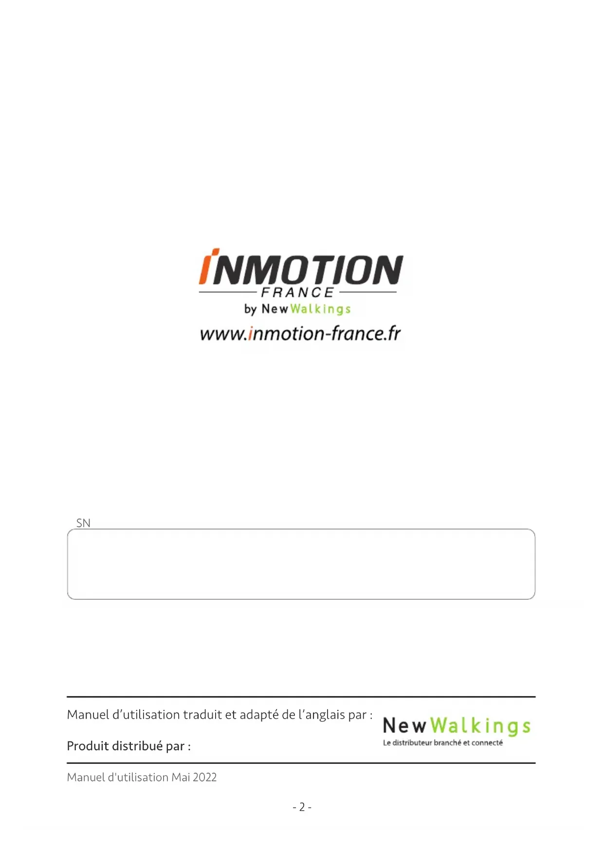 Produit distribué par : Manuel d’utilisation traduit et adapté de l’anglais par : Manuel d'utilisation Mai 2022 SN- 3 - Introduction Merci d’avoir fait conance à Inmotion France by New Walkings pour votre achat. A propos de ce manuel Lisez ce manuel avec attention et dans son intégralité. Observez bien les conseils et les mises en garde listés an de rouler en toute sécurité. Pour toute question ou information ne gurant pas dans ce manuel, prenez contact avec votre revendeur agréé par Inmotion France by New Walkings ou le service après vente de Inmotion France by New Walkings. Photos non contractuelles. Les fonctions et les performances du produit ainsi que le manuel d’utilisation peuvent être modiés sans préavis. Présentation du produit La V12 est un monocycle électrique avec une roue de 16”, un moteur puissant, un BMS intelligent et d’autres caractéristiques et fonctions remarquables. Basé sur le principe de l’équilibre dynamique, les changements de postures et d’inclinaisons de la gyroroue sont détectés par le gyroscope et le capteur d’accélération intégrés. Parallèlement, l’utilisateur est capable de conduire sa gyroroue grâce au système de servocommande, lui permettant d’avancer, d’accélérer, de décélérer, de freiner, en se penchant en avant ou en arrière. Pour apprendre la gyroroue, des vidéos d’apprentissage sont à votre disposition sur notre site internet http://bit.ly/Inmotion-tutoroue Ou directement sur notre chaîne YouTube NEWWALKINGS InmotionFrance via le QRcode ci-contre.- 4 - - 5 - Consignes de sécurité