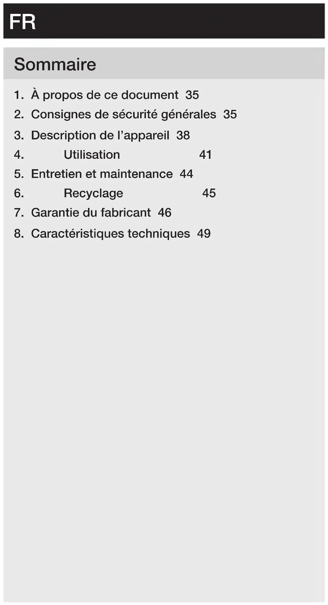 L’appareil ne nécessite aucun entretien. L’appareil est conforme aux dispositions de sécurité appli- cables. Les réparations ne doivent être eectuées que par un électricien professionnel, sinon il y a risque d’accident. Maintenance par les utilisateurs. Exigences envers les utilisateurs : – connaissance de ce guide. Des exigences particulières s’appliquent aux utilisateurs suivants : – Enfants à partir de 8 ans et plus.FR – 45 – Sommaire – Les personnes dont les capacités physiques, senso- rielles ou mentales sont réduites. – Les personnes manquant d’expérience et de connais- sances. Ces utilisateurs ne peuvent intervenir qu’en cas de mainte- nance. Exigences particulières : – Les utilisateurs sont supervisés. – Les utilisateurs ont été formés à l’utilisation sûre de l’appareil. – Les utilisateurs comprennent les risques liés à l’utilisation de l’appareil. – Il est interdit aux enfants de jouer avec l’appareil. Risque d’électrocution ! Si des pièces sous tension sont au contact avec de l’eau, il y a risque d’électrocution, de brûlures, voire danger de mort.