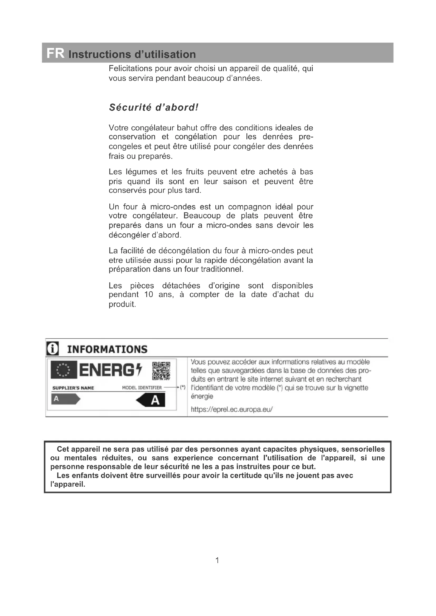5Felicitations pour avoir choisi un appareil de qualité, qui vous servira pendant beaucoup d’années. Sécurité d’abord! Votre congélateur bahut offre des conditions ideales de conservation et congélation pour les denrées pre- congeles et peut être utilisé pour congéler des denrées frais ou preparés. Les légumes et les fruits peuvent etre achetés à bas pris quand ils sont en leur saison et peuvent être conservés pour plus tard. Un four à micro-ondes est un compagnon idéal pour votre congélateur. Beaucoup de plats peuvent être preparés dans un four a micro-ondes sans devoir les décongéler d’abord. La facilité de décongélation du four à micro-ondes peut etre utilisée aussi pour la rapide décongélation avant la préparation dans un four traditionnel. Les pièces détachées d’origine sont disponibles pendant 10 ans, à compter de la date d’achat du produit.