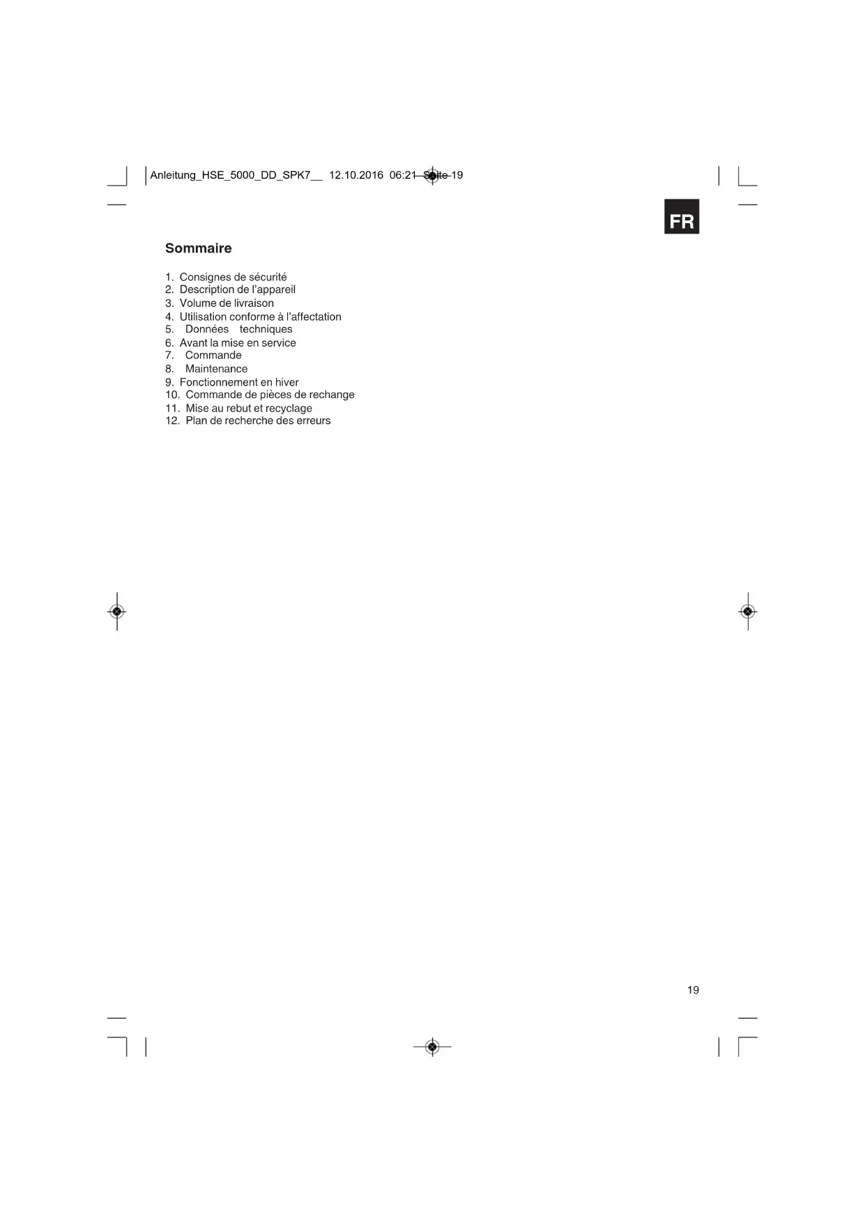 L’appareil se trouve dans un emballage permettant d’éviter les dommages dus au transport. Cet emballage est une matière première et peut donc être réutilisé ultérieurement ou être réintroduit dans le circuit des matières premières. L’appareil et ses accessoires sont en matériaux divers, comme par ex. des métaux et matières plastiques. Eliminez les composants défectueux dans les systèmes d’élimination des déchets spéciaux. Renseignez-vous dans un commerce spécialisé ou auprès de l’administration de votre commune ! Anleitung_HSE_5000_DD_SPK7__ 12.10.2016 06:21 Seite 24FR