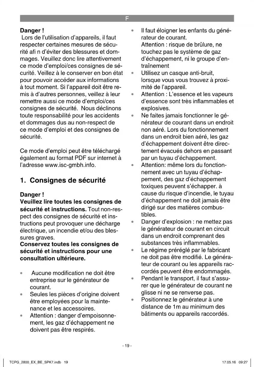 Danger ! Lors de l’utilisation d’appareils, il faut respecter certaines mesures de sécu- rité afi n d’éviter des blessures et dom- mages. Veuillez donc lire attentivement ce mode d’emploi/ces consignes de sé- curité. Veillez à le conserver en bon état pour pouvoir accéder aux informations à tout moment. Si l’appareil doit être re- mis à d’autres personnes, veillez à leur remettre aussi ce mode d’emploi/ces consignes de sécurité. Nous déclinons toute responsabilité pour les accidents et dommages dus au non-respect de ce mode d’emploi et des consignes de sécurité. Ce mode d’emploi peut être téléchargé également au format PDF sur internet à l’adresse www.isc-gmbh.info.