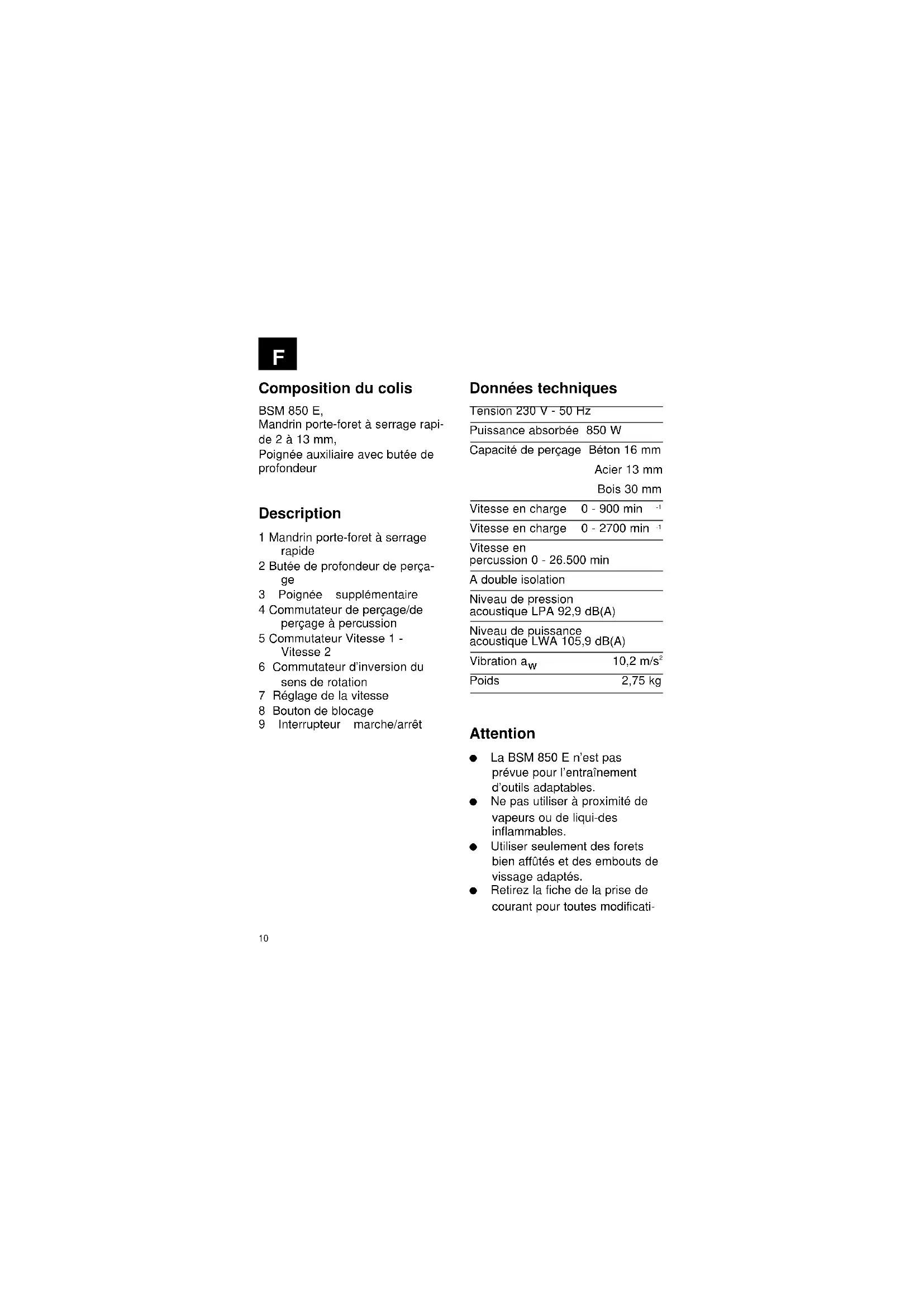Poids 2,75 kg Attention La BSM 850 E n’est pas prévue pour l’entraînement d’outils adaptables. Ne pas utiliser à proximité de vapeurs ou de liqui-des inflammables. Utiliser seulement des forets bien affûtés et des embouts de vissage adaptés. Retirez la fiche de la prise de courant pour toutes modificati-11