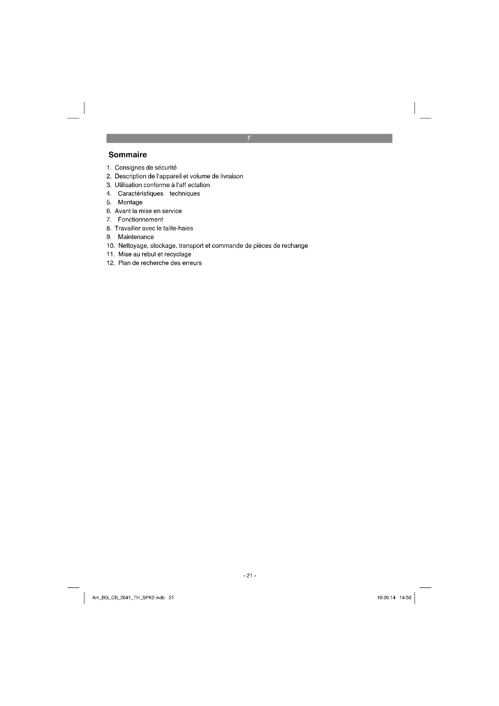 Ne faites pas tourner la machine pendant le démarrage ou lors de la coupe à une vitesse de rotation faible. Réglez l‘inclinaison de la lame de coupe (fi g. 11-14) Danger ! Éteignez le moteur avant de procéder à des réglages. Pour garantir une position de travail ergonomique, la lame de coupe peut être inclinée. Saisissez le levier de réglage (pos. 3) de la main gauche. Acti- onnez à l‘aide de l‘index tout d‘abord le levier A et ensuite avec le pouce le levier B. Placez la lame de coupe dans la position souhaitée. Lorsqu‘on relâche les leviers A et B, la lame de coupe se bloque. Coupe1 pour obtenir un feuillage dense: le mouvement, le plus effi cace est un mouvement large et continu, ce faisant vous guidez les cou- teaux de l‘unité de coupe directement au travers des branches. Une légère inclinaison de l‘unité de coupe vers le bas, dans le sens du mouvement donne le meilleur résultat de coupe (fi g. 22). Pour obtenir une hauteur de haie régulière, il est recommandé de tendre un fi l comme repère le long de l‘arête de la haie. Les branches qui dé- passent seront coupées. Coupe latérale d‘une haie : les surfaces latérales d‘une haie se coupent du bas vers le haut dans un mouvement d‘arc. (Fig.23) du fait du type de construction de la machine, il peut arriver que lors de travaux prolongés sur les côtés de la haie, le moteur s‘éteigne si le réser- voir n‘est pas complètement rempli. Anl_BG_CB_2041_TH_SPK2.indb 25Anl_BG_CB_2041_TH_SPK2.indb 25 10.09.14 14:5010.09.14 14:50F