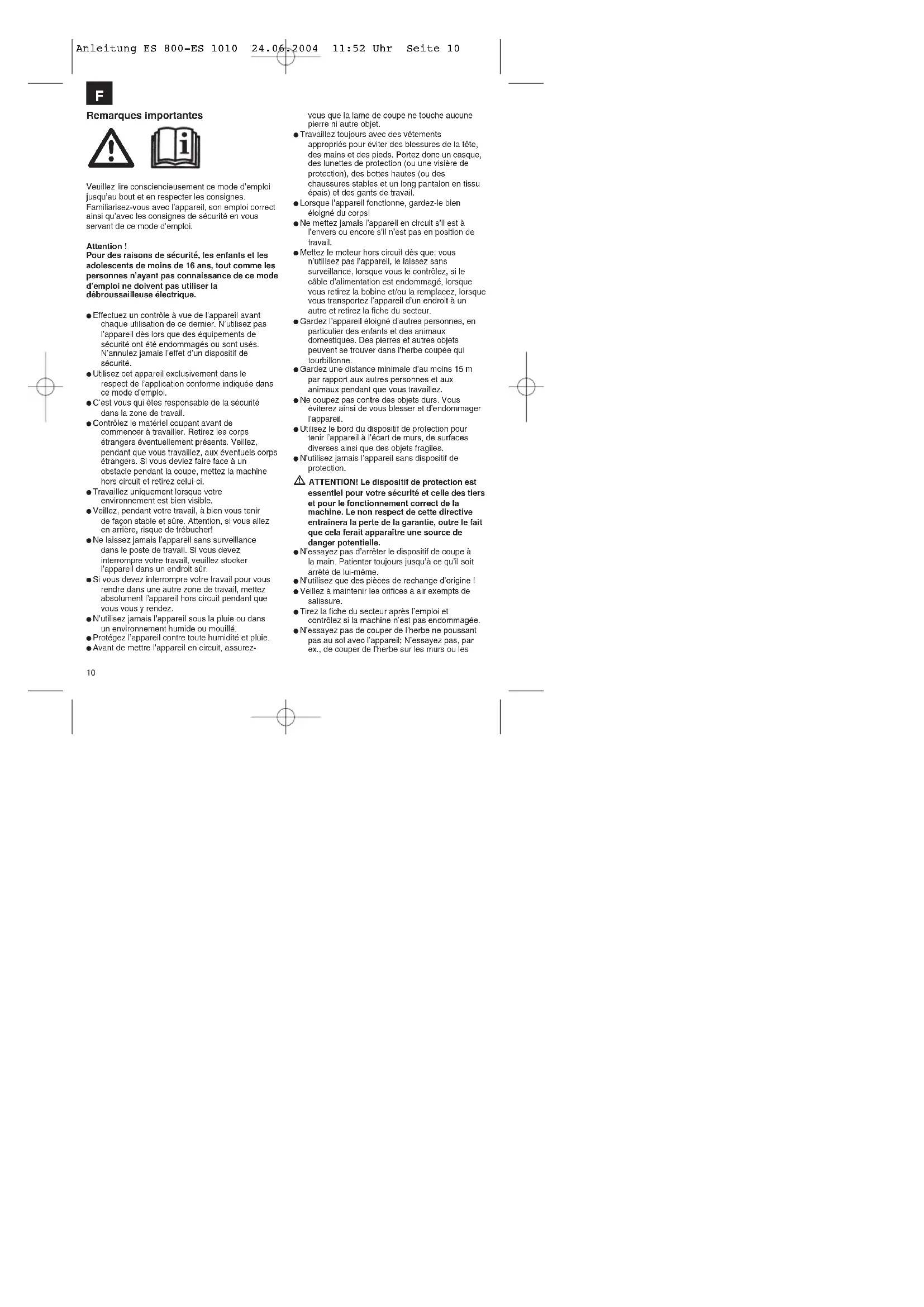 Anleitung ES 800-ES 1010 24.06.2004 11:52 Uhr Seite 10pierres. Dans la zone de travail du coupe-bordure, l’utilisateur est entièrement responsable vis-à-vis de tiers d’éventuels dommages causés par l’utilisation de l’appareil. Ne traversez pas de route ou de chemin caillouteux avec l’appareil en circuit. Si vous n’utilisez pas l’appareil, conservez-le dans un lieu sec et inaccessible pour les enfants. Utilisez exclusivement l’appareil tel que décrit dans ce mode d’emploi Contrôlez régulièrement si les vis sont bien serrées. La tension du secteur doit correspondre à celle indiquée sur la plaque signalétique. La ligne de raccordement doit être régulièrement contrôlée pour détecter un endommagement ou une usure éventuels. L’appareil ne doit pas être utilisé si l’état de la ligne de raccordement n’est pas impeccable. Les lignes de raccordement utilisées ne doivent pas être plus légères que des lignes en tuyau de caoutchouc légères HO7RN-F conformément à la norme DIN 57282/VDE 0282 et doivent avoir un diamètre minimal de 1,5 mm2. Les raccords à fiche doivent être dotés de contacts de protection et l’accouplement doit être protégé contre les éclaboussures. Retirez toujours les câbles et autres objets de la surface devant être coupée. Si l’appareil doit être soulevé à des fins de transport, mettez le moteur hors circuit et attendez que l’outil soit complètement arrêté. Avant de s’éloigner de l’appareil, mettez le moteur hors circuit et retirez la fiche secteur. Avant de raccorder l’appareil au réseau, assurez-vous qu’aucun des éléments en rotation ne soit endommagé et que la lame soit bien correctement montée et fixée. Pendant le fonctionnement, vous ne devez en aucun cas couper des objets durs, vous éviterez de la sorte des blessures de l’utilisateur et des dommages de l’appareil. Pour la maintenance, n’utilisez que des pièces de rechange d’origine. Les réparations doivent exclusivement être effectuées par un(e) spécialiste en électricité. Attention : La lame continue à tourner pendant quelques secondes après l’arrêt !