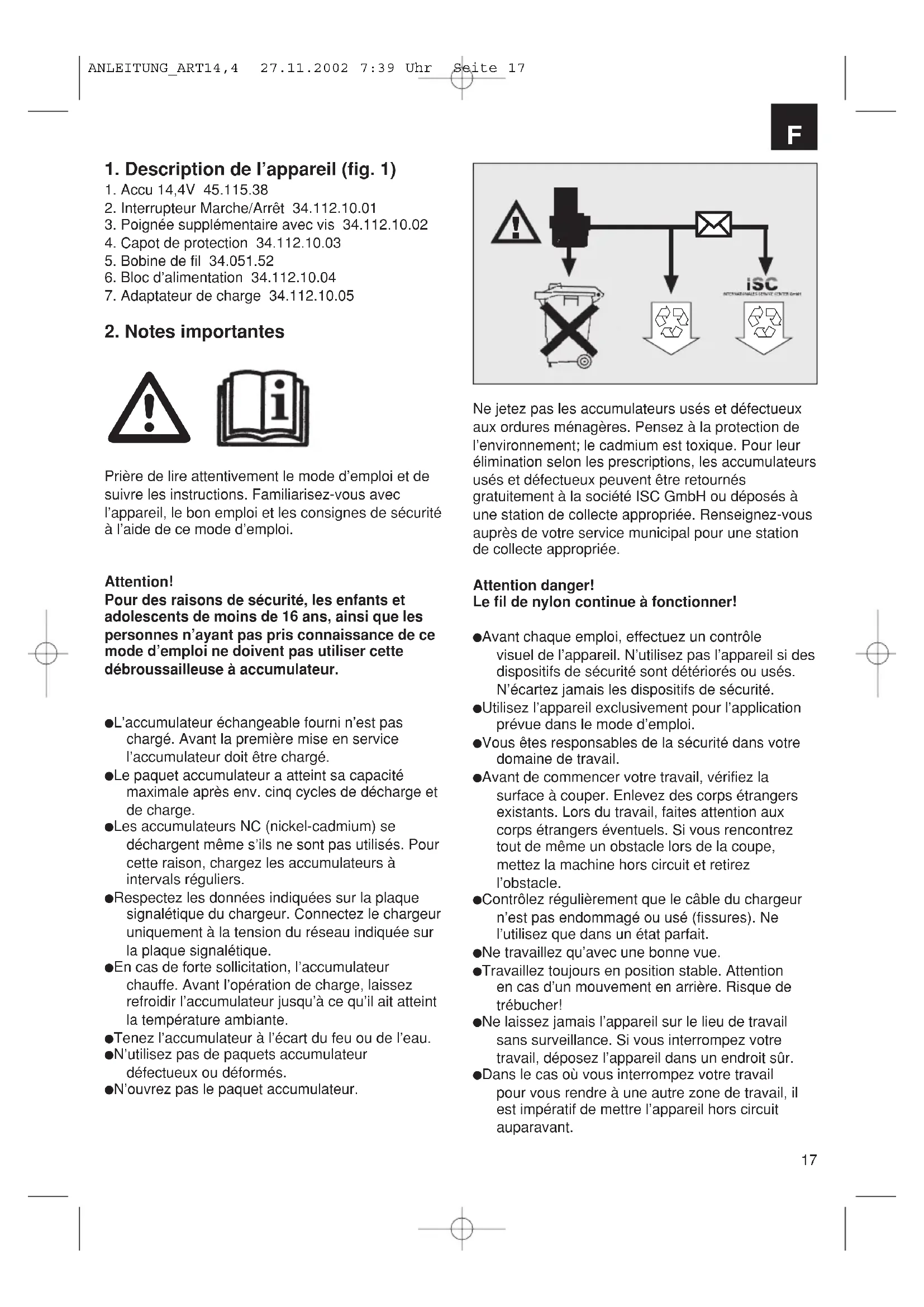 1. Description de l’appareil (fig. 1)1. Accu 14,4V 45.115.382. Interrupteur Marche/Arrêt 34.112.10.01 3. Poignée supplémentaire avec vis 34.112.10.024. Capot de protection 34.112.10.035. Bobine de fil 34.051.526. Bloc d’alimentation 34.112.10.047. Adaptateur de charge 34.112.10.052. Notes importantes Prière de lire attentivement le mode d’emploi et desuivre les instructions. Familiarisez-vous avecl’appareil, le bon emploi et les consignes de sécuritéà l’aide de ce mode d’emploi.Attention!Pour des raisons de sécurité, les enfants etadolescents de moins de 16 ans, ainsi que lespersonnes n’ayant pas pris connaissance de cemode d’emploi ne doivent pas utiliser cettedébroussailleuse à accumulateur. L’accumulateur échangeable fourni n’est pas chargé. Avant la première mise en service l’accumulateur doit être chargé. Le paquet accumulateur a atteint sa capacité maximale après env. cinq cycles de décharge et de charge. Les accumulateurs NC (nickel-cadmium) se déchargent même s’ils ne sont pas utilisés. Pour cette raison, chargez les accumulateurs à intervals réguliers. Respectez les données indiquées sur la plaque signalétique du chargeur. Connectez le chargeur uniquement à la tension du réseau indiquée sur la plaque signalétique. En cas de forte sollicitation, l’accumulateur chauffe. Avant l’opération de charge, laissez refroidir l’accumulateur jusqu’à ce qu’il ait atteint la température ambiante. Tenez l’accumulateur à l’écart du feu ou de l’eau. N’utilisez pas de paquets accumulateur défectueux ou déformés. N’ouvrez pas le paquet accumulateur.Ne jetez pas les accumulateurs usés et défectueuxaux ordures ménagères. Pensez à la protection del’environnement; le cadmium est toxique. Pour leurélimination selon les prescriptions, les accumulateursusés et défectueux peuvent être retournésgratuitement à la société ISC GmbH ou déposés àune station de collecte appropriée. Renseignez-vousauprès de votre service municipal pour une stationde collecte appropriée.Attention danger!Le fil de nylon continue à fonctionner! Avant chaque emploi, effectuez un contrôle visuel de l’appareil. N’utilisez pas l’appareil si desdispositifs de sécurité sont détériorés ou usés. N’écartez jamais les dispositifs de sécurité. Utilisez l’appareil exclusivement pour l’applicationprévue dans le mode d’emploi. Vous êtes responsables de la sécurité dans votredomaine de travail. Avant de commencer votre travail, vérifiez la surface à couper. Enlevez des corps étrangers existants. Lors du travail, faites attention aux corps étrangers éventuels. Si vous rencontrez tout de même un obstacle lors de la coupe, mettez la machine hors circuit et retirez l’obstacle. Contrôlez régulièrement que le câble du chargeurn’est pas endommagé ou usé (fissures). Ne l’utilisez que dans un état parfait. Ne travaillez qu’avec une bonne vue. Travaillez toujours en position stable. Attention en cas d’un mouvement en arrière. Risque de trébucher! Ne laissez jamais l’appareil sur le lieu de travail sans surveillance. Si vous interrompez votre travail, déposez l’appareil dans un endroit sûr. Dans le cas où vous interrompez votre travail pour vous rendre à une autre zone de travail, il est impératif de mettre l’appareil hors circuit auparavant.
