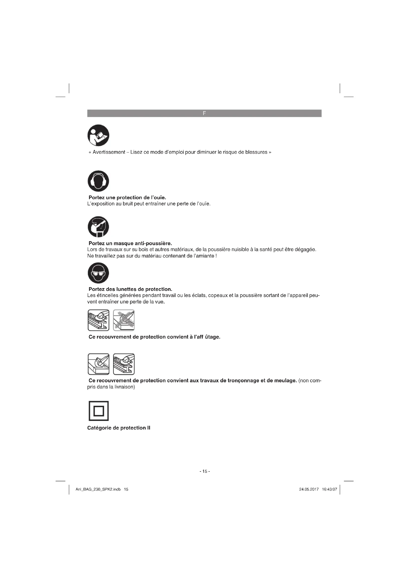« Avertissement – Lisez ce mode d’emploi pour diminuer le risque de blessures » Portez une protection de l’ouïe. L’exposition au bruit peut entraîner une perte de l’ouïe. Portez des lunettes de protection. Les étincelles générées pendant travail ou les éclats, copeaux et la poussière sortant de l’appareil peu- vent entraîner une perte de la vue. Portez un masque anti-poussière. Lors de travaux sur su bois et autres matériaux, de la poussière nuisible à la santé peut être dégagée. Ne travaillez pas sur du matériau contenant de l’amiante ! Ce recouvrement de protection convient aux travaux de tronçonnage et de meulage. (non com- pris dans la livraison) Ce recouvrement de protection convient à l’aff ûtage. Catégorie de protection II Anl_BAG_230_SPK2.indb 15Anl_BAG_230_SPK2.indb 15 24.05.2017 16:43:0724.05.2017 16:43:07F