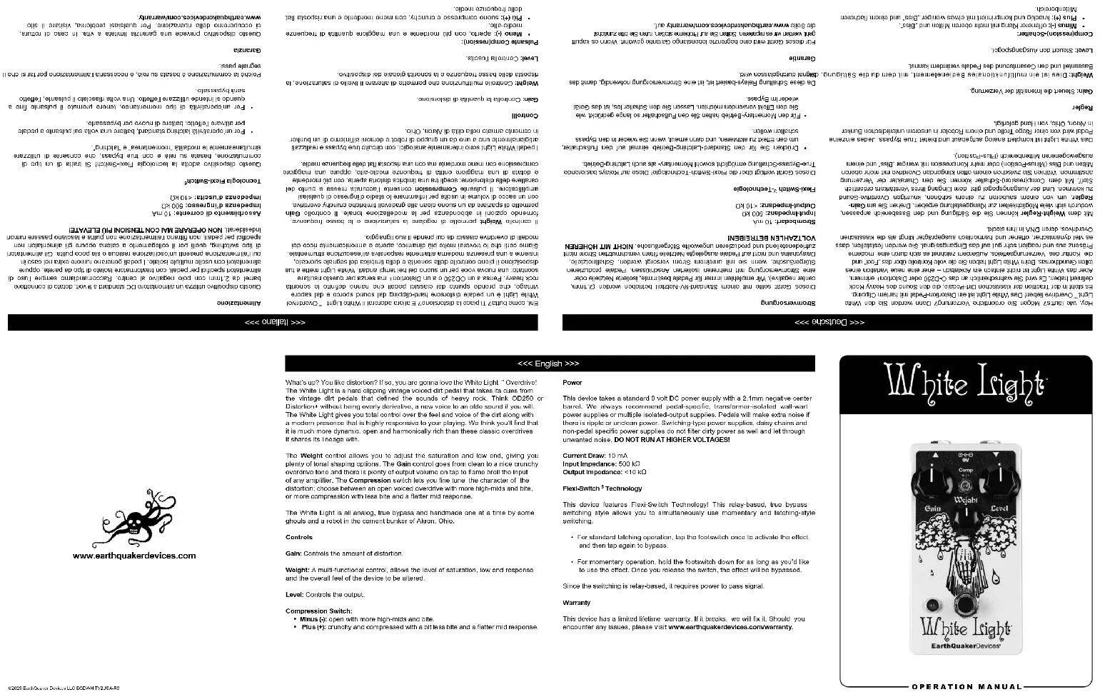 - Pour un fonctionnement momentané, maintenez la pédale enfoncée aussi longtemps que vous souhaitez utiliser l’effet. Une fois que vous relâchez le commutateur, l’effet sera ignoré. Comme la commutation est basée sur des relais, le signal doit être alimenté. Garantie Cet appareil a une garantie à vie limitée. Si ça casse, on répare. Si vous rencontrez des problèmes, veuillez visiter www.earthquakerdevices.com/warranty. <<< Español >>> ¿Qué? ¿Le gusta la distorsión? Si es así, ¡le encantará el White Light