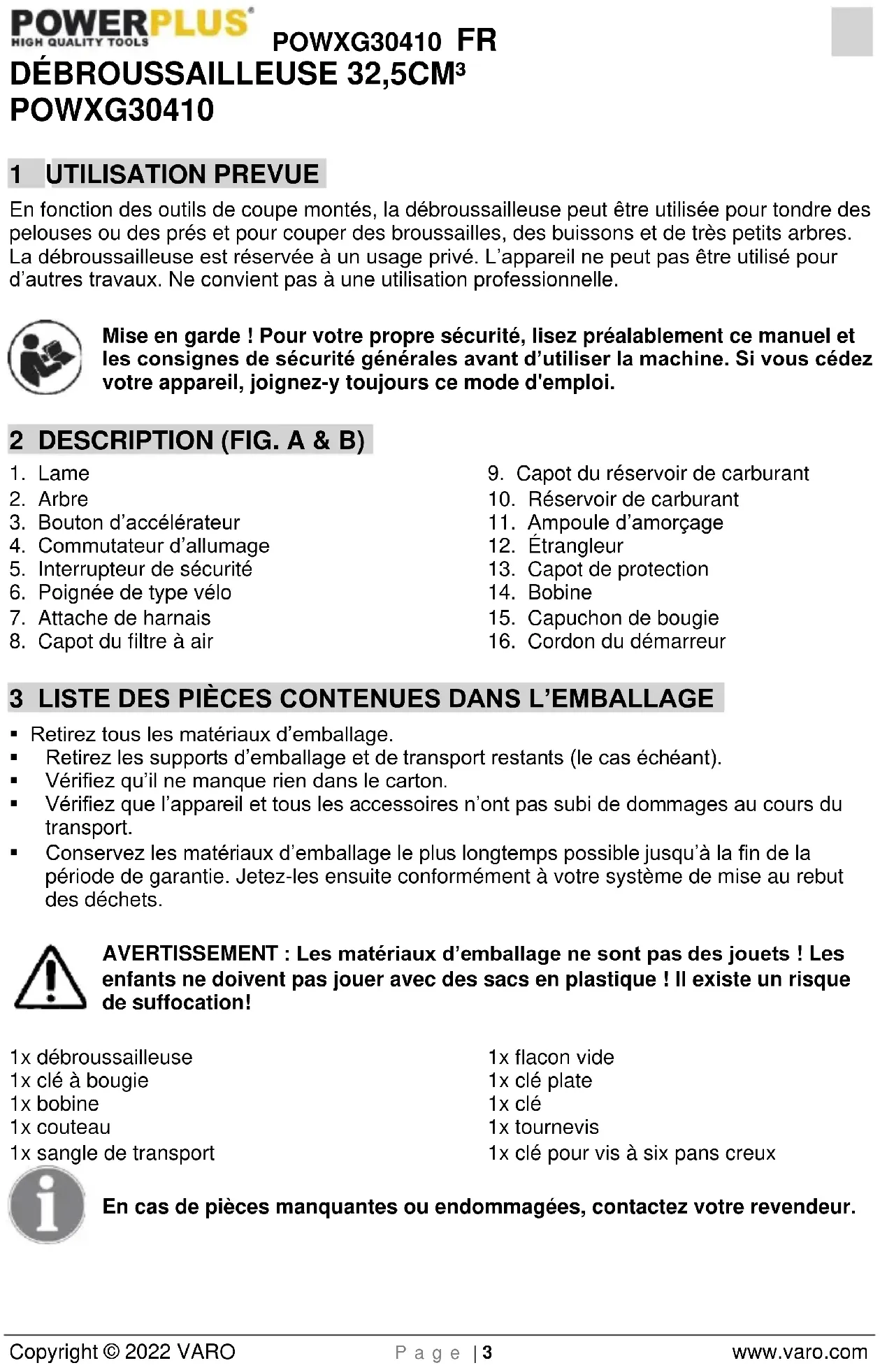 - Lorsque l’outil est remisé pendant une longue période, vidangez le carburant du réservoir et du carburateur, nettoyez les pièces, déplacez l’outil vers un endroit sûr et vérifiez que le moteur a refroidi.POWXG30410 FR Copyright © 2022 VARO P a g e | 7 www.varo.com