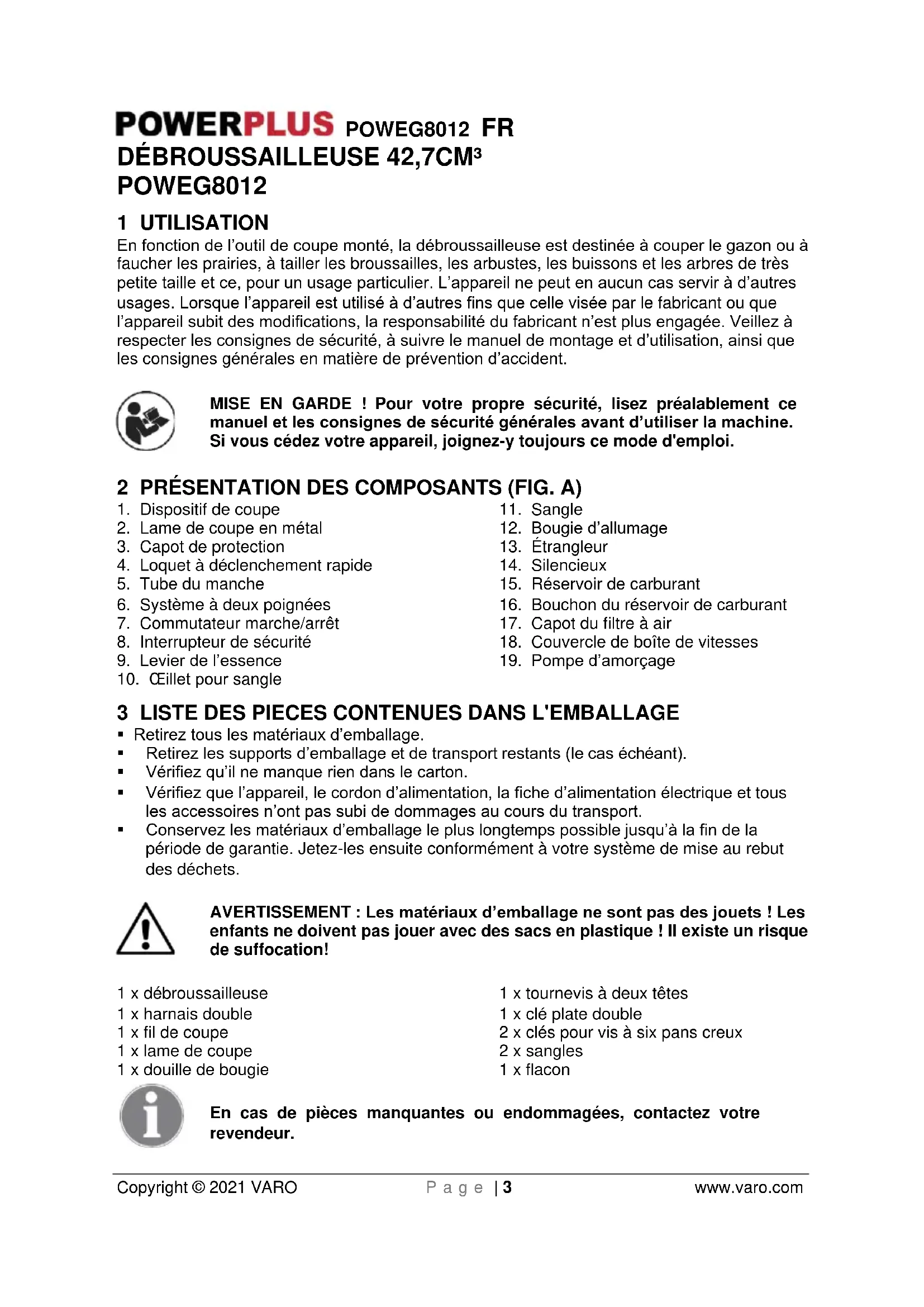 enfants ne doivent pas jouer avec des sacs en plastique ! Il existe un risque de suffocation! 1 x débroussailleuse 1 x harnais double 1 x fil de coupe 1 x lame de coupe 1 x douille de bougie 1 x tournevis à deux têtes 1 x clé plate double 2 x clés pour vis à six pans creux 2 x sangles 1 x flacon En cas de pièces manquantes ou endommagées, contactez votre revendeur.POWEG8012 FR Copyright © 2021 VARO P a g e | 4 www.varo.com 4 PICTOGRAMMES Les symboles suivants sont utilisés dans ce mode d’emploi et/ou sur la machine:
