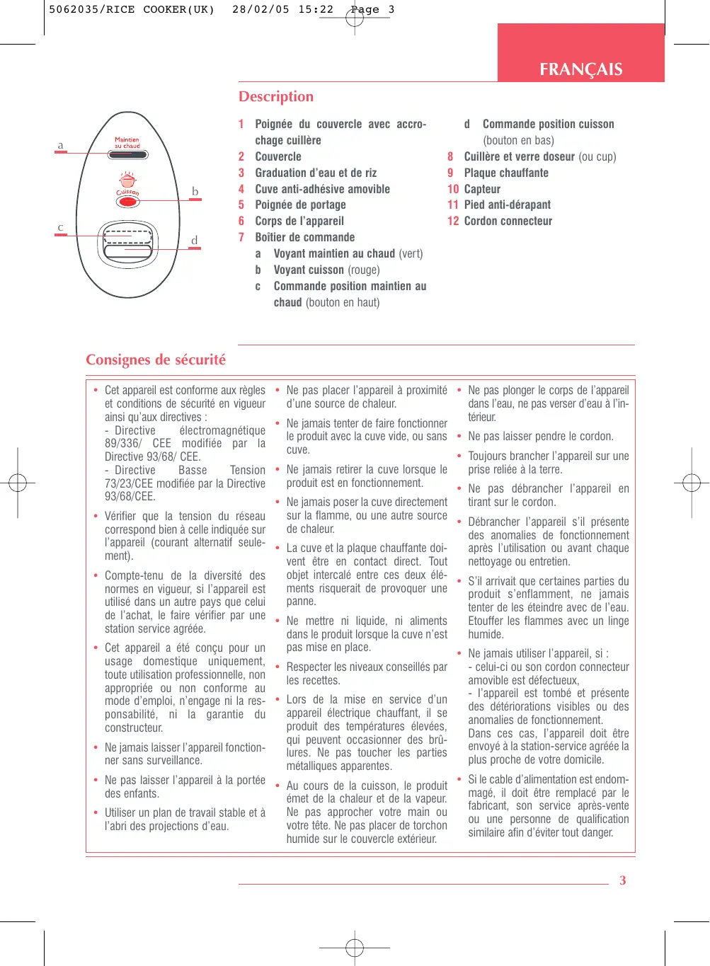 1 Poignée du couvercle avec accrochage cuillère 2 Couvercle 3 Graduation d’eau et de riz 4 Cuve anti-adhésive amovible 5 Poignée de portage 6 Corps de l’appareil 7 Boîtier de commande a Voyant maintien au chaud (vert) b Voyant cuisson (rouge) c Commande position maintien au chaud (bouton en haut)