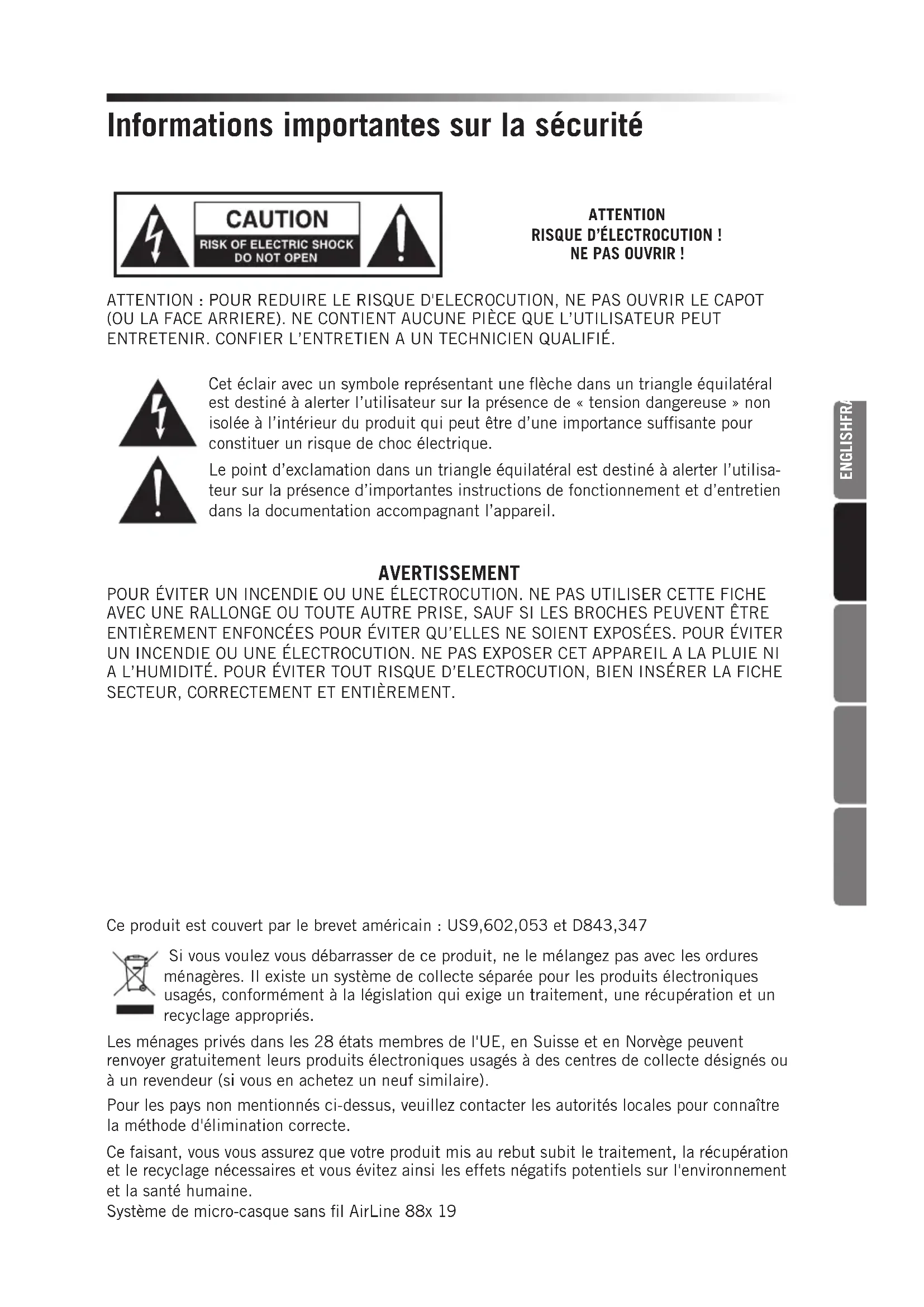 - Not for use in the USA and Canada. European Frequency Operation Note: This equipment is intended for professional musical and similar applications, and may be capable of operating on some frequencies not authorized in your region. Please contact your national authority to obtain information on authorized frequencies for wireless microphone products in your region. Band Frequency Range EU Country Codes Note Kª 470–494 MHz AT, BE, BG, CY, CZ, DK, EE, FI, FR, DE, GR, HU, IS, IE, IT, LV, LT, LU, MT, NL, NO, PL, PT, RO, SK, SI, ES, SE, CH, UK D** 542–566 MHz IL** 794–806 MHz For use in Israel B** 806–810 MHz For use in Japan G 863–865 MHz AT, BE, BG, CY, CZ, DK, EE, FI, FR, DE, GR, HU, IS, IE, IT, LV, LT, LU, MT, NL, NO, PL, PT, RO, SK, SI, ES, SE, CH, UK License Free ** Not for use in the EU. ª Licensing: Note that a ministerial license to operate this equipment may be required in certain areas. Consult your national authority for possible requirements. Licensing of Samson wireless microphone equipment is the user’s responsibility, and licensability depends on the user’s classification and application, and on the selected frequency.Informations importantes sur la sécurité ATTENTION: POUR REDUIRE LE RISQUE D'ELECROCUTION, NE PAS OUVRIR LE CAPOT (OU LA FACE ARRIERE). NE CONTIENT AUCUNE PIÈCE QUE L’UTILISATEUR PEUT ENTRETENIR. CONFIER L’ENTRETIEN A UN TECHNICIEN QUALIFIÉ. Cet éclair avec un symbole représentant une flèche dans un triangle équilatéral est destiné à alerter l’utilisateur sur la présence de «tension dangereuse» non isolée à l’intérieur du produit qui peut être d’une importance suffisante pour constituer un risque de choc électrique. Le point d’exclamation dans un triangle équilatéral est destiné à alerter l’utilisa- teur sur la présence d’importantes instructions de fonctionnement et d’entretien dans la documentation accompagnant l’appareil. ATTENTION RISQUE D’ÉLECTROCUTION! NE PAS OUVRIR! AVERTISSEMENT POUR ÉVITER UN INCENDIE OU UNE ÉLECTROCUTION. NE PAS UTILISER CETTE FICHE AVEC UNE RALLONGE OU TOUTE AUTRE PRISE, SAUF SI LES BROCHES PEUVENT ÊTRE ENTIÈREMENT ENFONCÉES POUR ÉVITER QU’ELLES NE SOIENT EXPOSÉES. POUR ÉVITER UN INCENDIE OU UNE ÉLECTROCUTION. NE PAS EXPOSER CET APPAREIL A LA PLUIE NI A L’HUMIDITÉ. POUR ÉVITER TOUT RISQUE D’ELECTROCUTION, BIEN INSÉRER LA FICHE SECTEUR, CORRECTEMENT ET ENTIÈREMENT. Si vous voulez vous débarrasser de ce produit, ne le mélangez pas avec les ordures ménagères. Il existe un système de collecte séparée pour les produits électroniques usagés, conformément à la législation qui exige un traitement, une récupération et un recyclage appropriés. Les ménages privés dans les 28 états membres de l'UE, en Suisse et en Norvège peuvent renvoyer gratuitement leurs produits électroniques usagés à des centres de collecte désignés ou à un revendeur (si vous en achetez un neuf similaire). Pour les pays non mentionnés ci-dessus, veuillez contacter les autorités locales pour connaître la méthode d'élimination correcte. Ce faisant, vous vous assurez que votre produit mis au rebut subit le traitement, la récupération et le recyclage nécessaires et vous évitez ainsi les effets négatifs potentiels sur l'environnement et la santé humaine. Ce produit est couvert par le brevet américain: US9,602,053 et D843,347 Système de micro-casque sans fil AirLine 88x 19 ENGLISHFRANÇAISDEUTSCHEESPAÑOLITALIANOInformations importantes sur la sécurité