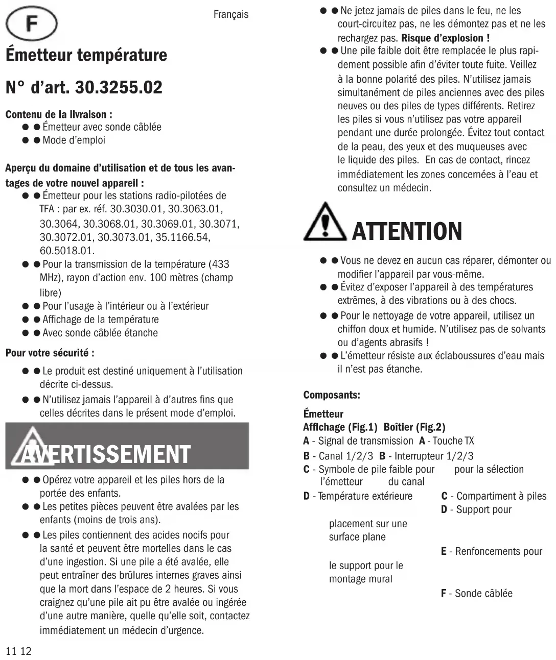 11/2022 10Français Émetteur température N° d’art. 30.3255.02 Contenu de la livraison : Émetteur avec sonde câblée Mode d’emploi Aperçu du domaine d’utilisation et de tous les avan- tages de votre nouvel appareil : Émetteur pour les stations radio-pilotées de TFA : par ex. réf. 30.3030.01, 30.3063.01, 30.3064, 30.3068.01, 30.3069.01, 30.3071, 30.3072.01, 30.3073.01, 35.1166.54,