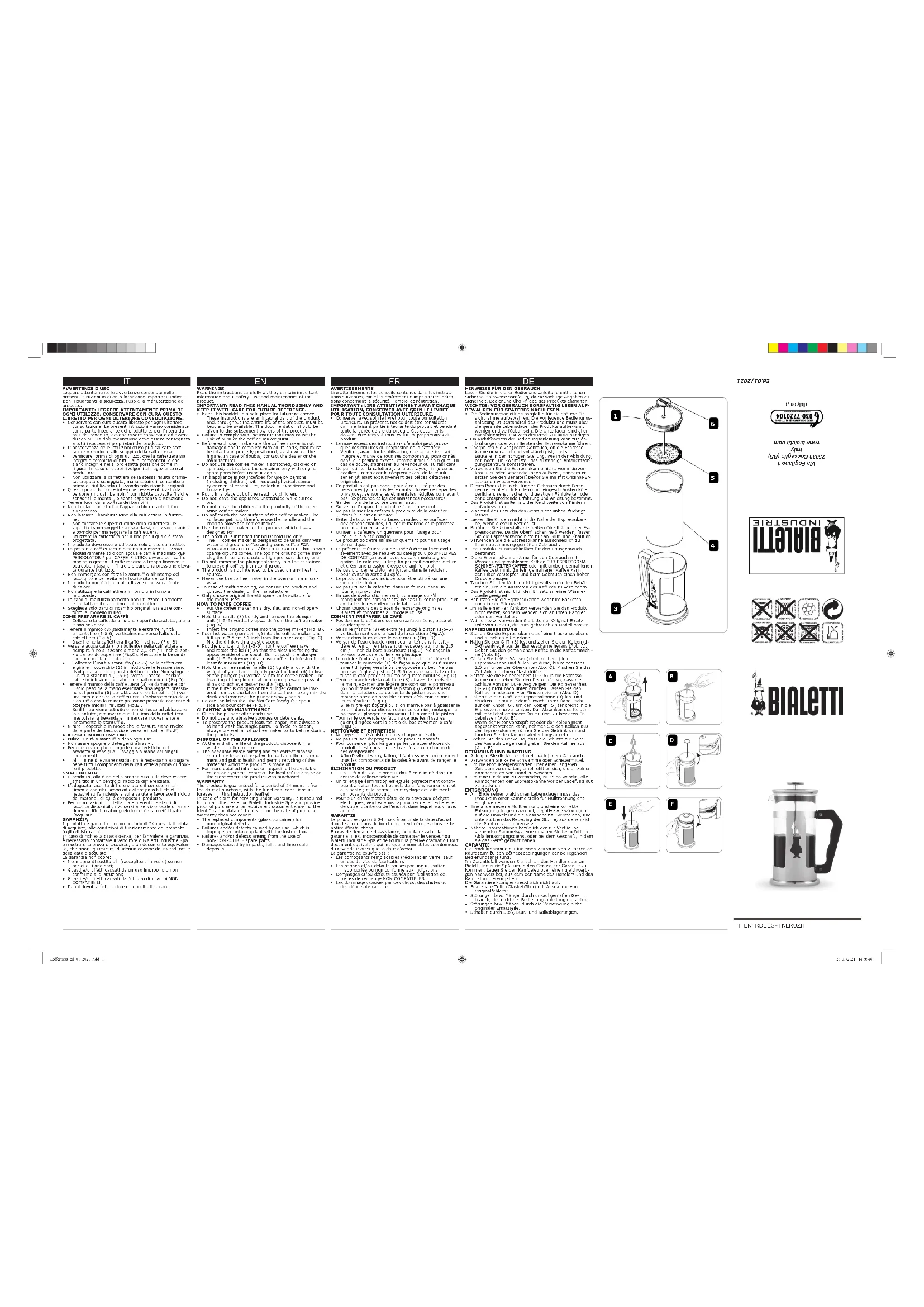 - Pour plus d’information détaillée relative aux déchets électriques, veuillez vous rapprocher de la déchèterie de votre localité ou de l’endroit dans lequel vous l’avez acheté. GARANTIE Le produit est garanti 24 mois à partir de la date d’achat dans les conditions de fonctionnement décrites dans cette notice d’instructions. En cas de demande d’assistance, pour faire valoir la garantie, il est indispensable de contacter le vendeur ou Bialetti Industrie Spa et de fournir la preuve d’achat ou tout document équivalent qui indique le nom et les coordonnées du revendeur ainsi que la date d’achat. La garantie ne couvre pas :