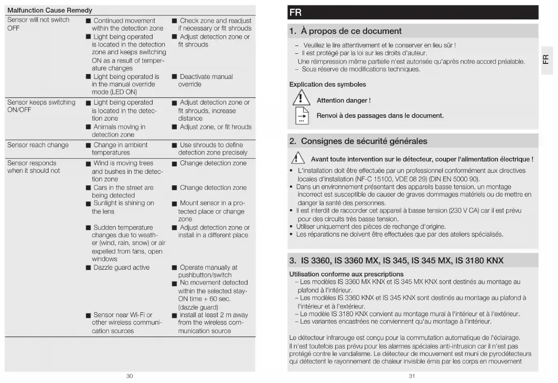 Attention danger ! Renvoi à des passages dans le document 2 Consignes de sécurité générales Avant toute intervention sur le détecteur, couper l'alimentation électrique !• L'installation doit être eectuée par un professionnel conformément aux directives locales d'installation (NF-C 15100, VDE 08 29) (DIN EN 5000 90).• Dans un environnement présentant des appareils basse tension, un montage incorrect est susceptible de causer de graves dommages matériels ou de mettre en danger la santé des personnes.• Il est interdit de raccorder cet appareil à basse tension (230 V CA) car il est prévu pour des circuits très basse tension.• Utiliser uniquement des pièces de rechange d'origine.• Les réparations ne doivent être eectuées que par des ateliers spécialisés. 3 IS3360, IS3360 MX, IS345, IS 345 MX, IS3180 KNX Utilisation conforme aux prescriptions – Les modèles IS3360MXKNX et IS345MXKNX sont destinés au montage au plafond à l'intérieur. – Les modèles IS3360KNX et IS345KNXsont destinés au montage au plafond à l'intérieur et à l'extérieur. – Le modèle IS3180KNX convient au montage mural à l'intérieur et à l'extérieur. – Les variantes encastrées ne conviennent qu'au montage à l'intérieur.Le détecteur infrarouge est conçu pour la commutation automatique de l'éclairage. Il n'est toutefois pas prévu pour les alarmes spéciales anti-intrusion car il n'est pas protégé contre le vandalisme. Le détecteur de mouvement est muni de pyrodétecteurs qui détectent le rayonnement de chaleur invisible émis par les corps en mouvement